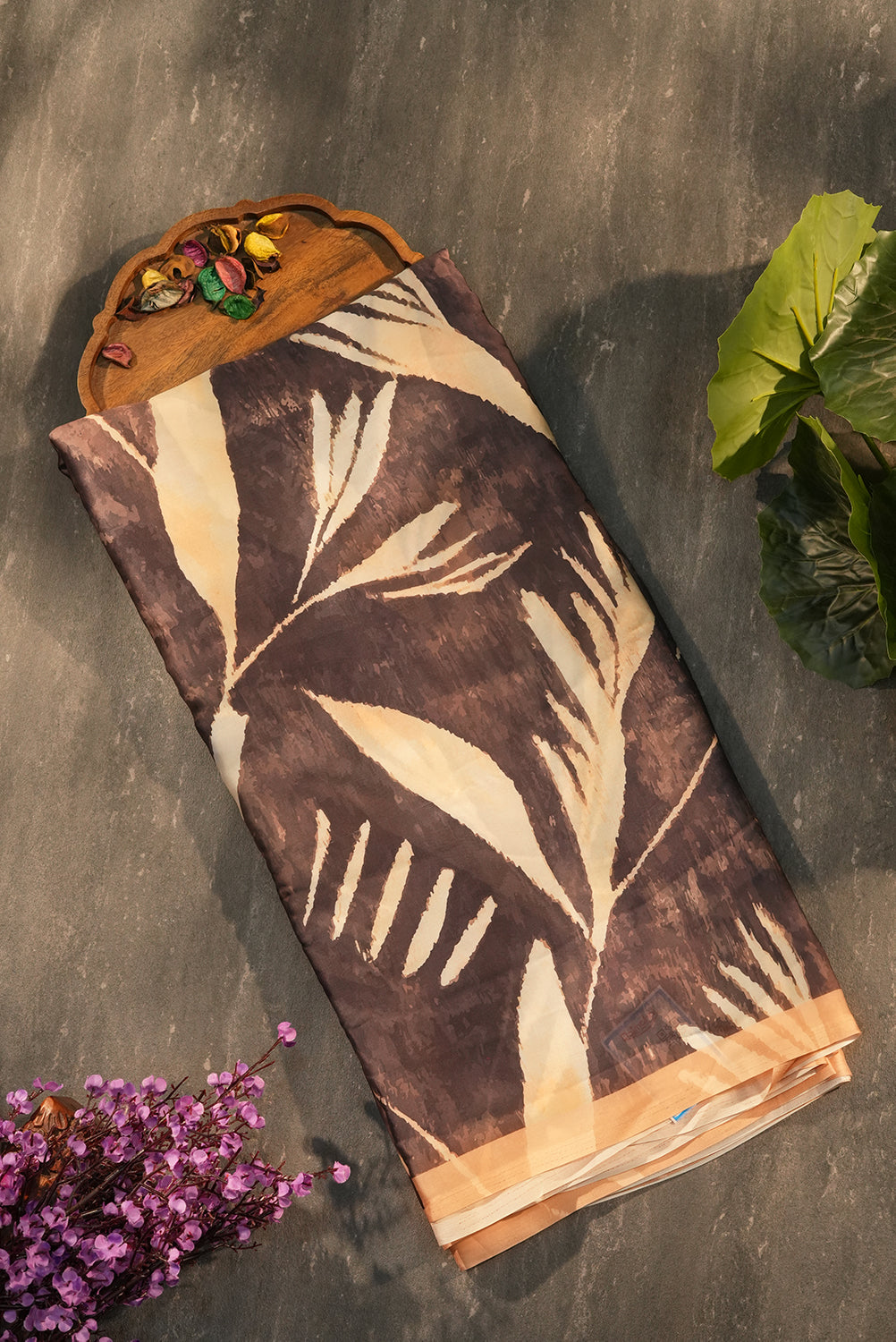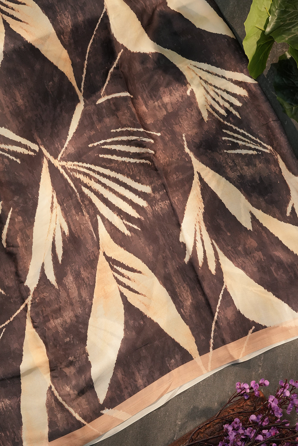 This exquisite Satin Saree blends the fluid grace of high-quality satin with a bold, abstract botanical motif. Featuring a striking contrast between coffee brown and creamy champagne tones, butter-soft drape that flows effortlessly, making it perfect for cocktail parties, gallery openings, dinner events. Unstitched blouse attached.