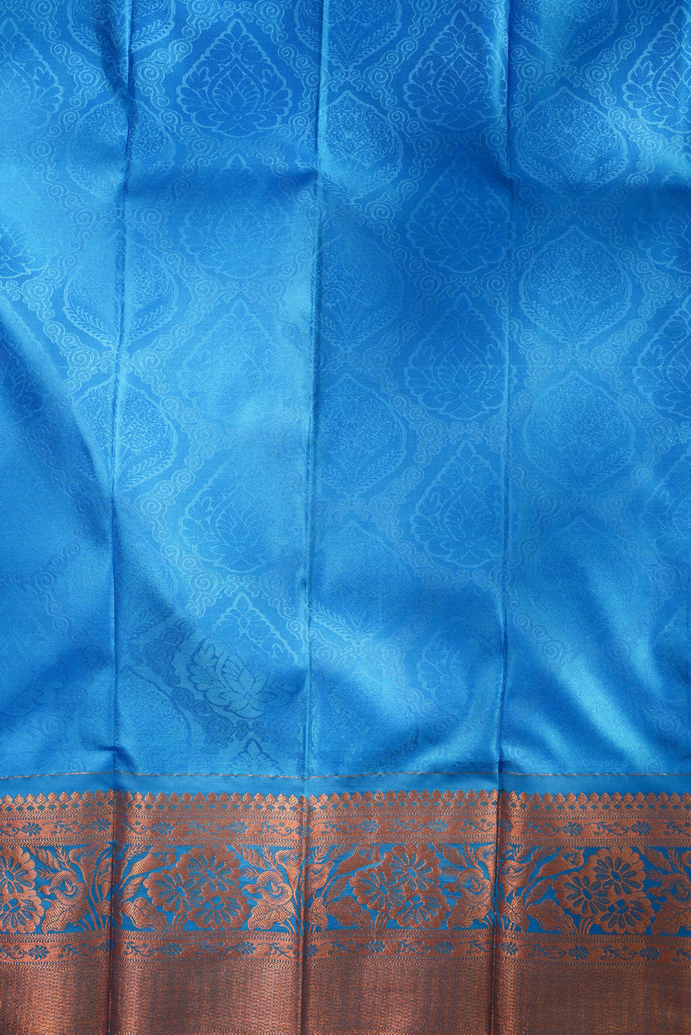 A mesmerizing interplay of colors, this saree glows with a vibrant orange-pink sheen reminiscent of a sunset. The look is anchored by a majestic violet border, woven heavily with gold zari vines for a truly regal finish. Unstitched blouse attached.