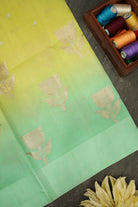 An elegant raw silk saree featuring a beautiful dual-tone design that transitions from a vibrant lemon yellow to a serene seafoam green. Adorned with delicate silver zari woven tulip motifs, this saree is a perfect blend of modern style and traditional craftsmanship. Unstitched blouse attached