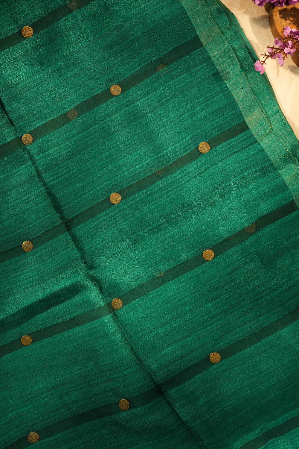 This is an exquisite, richly textured handloom silk saree in a captivating shade of Emerald Green or Deep Forest Green. The body features subtle woven horizontal stripes in a darker moss or hunter green tone, creating elegant contrast and texture. It is tastefully embellished with classic, circular coins in a warm antique gold finish. The fabric appears to be Tussar Silk, offering a beautiful, natural sheen and excellent drape. Unstitched blouse piece included.