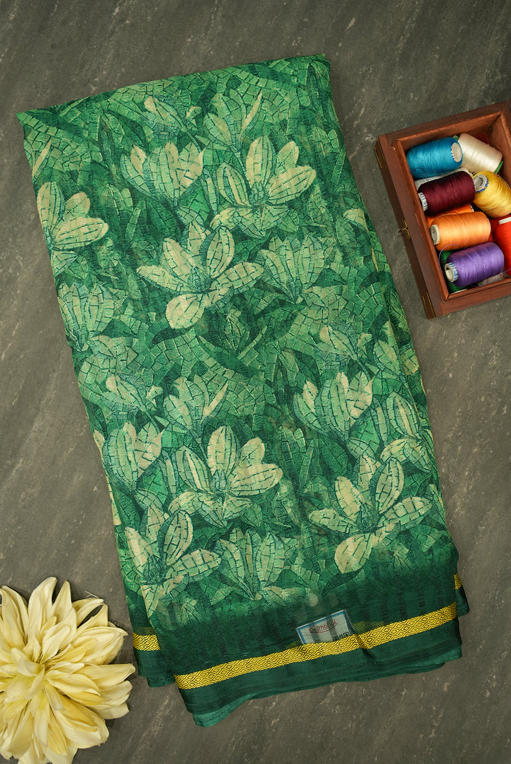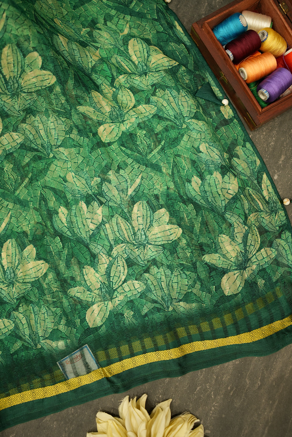 This enchanting chiffon saree features a rich forest green base with a striking mosaic-like print. The design incorporates intricate patterns of leaves and blossoms in varying shades of green and light beige, creating a textured, organic feel. The saree is finished with a simple yet elegant dark green border highlighted with a thin golden zari line. Lightweight and easy to drape, this saree is ideal for daytime gatherings and sophisticated casual events.