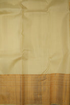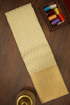 This elegant silk saree features a serene golden beige body, richly woven with intricate leaf-shaped motifs. The entire saree shimmers with the self-woven design, creating a luxurious texture. The saree is finished with a wide golden zari border, showcasing a beautiful blend of traditional geometric and floral patterns. This luxurious and classic saree is perfect for weddings, grand celebrations, and festive occasions.