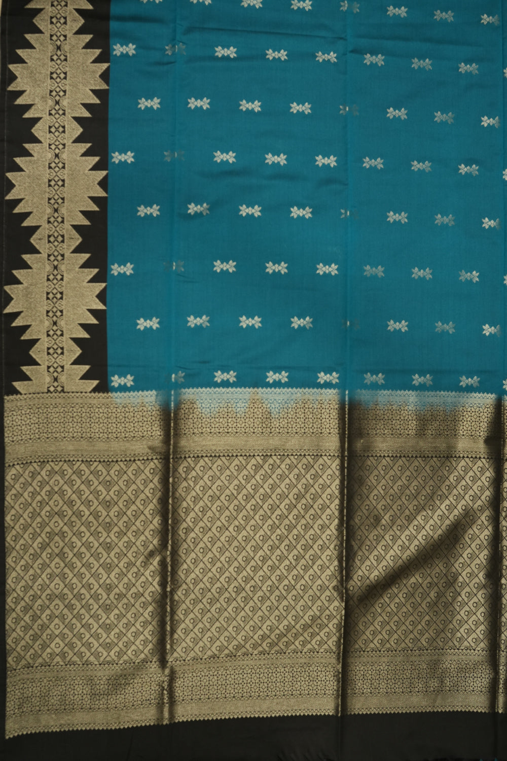 This beautiful soft silk saree features a vibrant teal blue body that transitions into a bold black and silver border. The intricate woven patterns and the delicate silver accents add a touch of glamour to this elegant piece, making it a timeless addition to your wardrobe. Unstitched blouse attached.