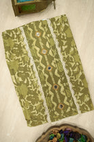 This beautiful unstitched cotton salwar suit material features a unique olive green color with a batik-like print. The kurta fabric is highlighted with intricate mirror work and delicate lace details, adding a touch of elegance. The set includes material for the kurta, salwar, and dupatta, all in coordinating shades and prints.