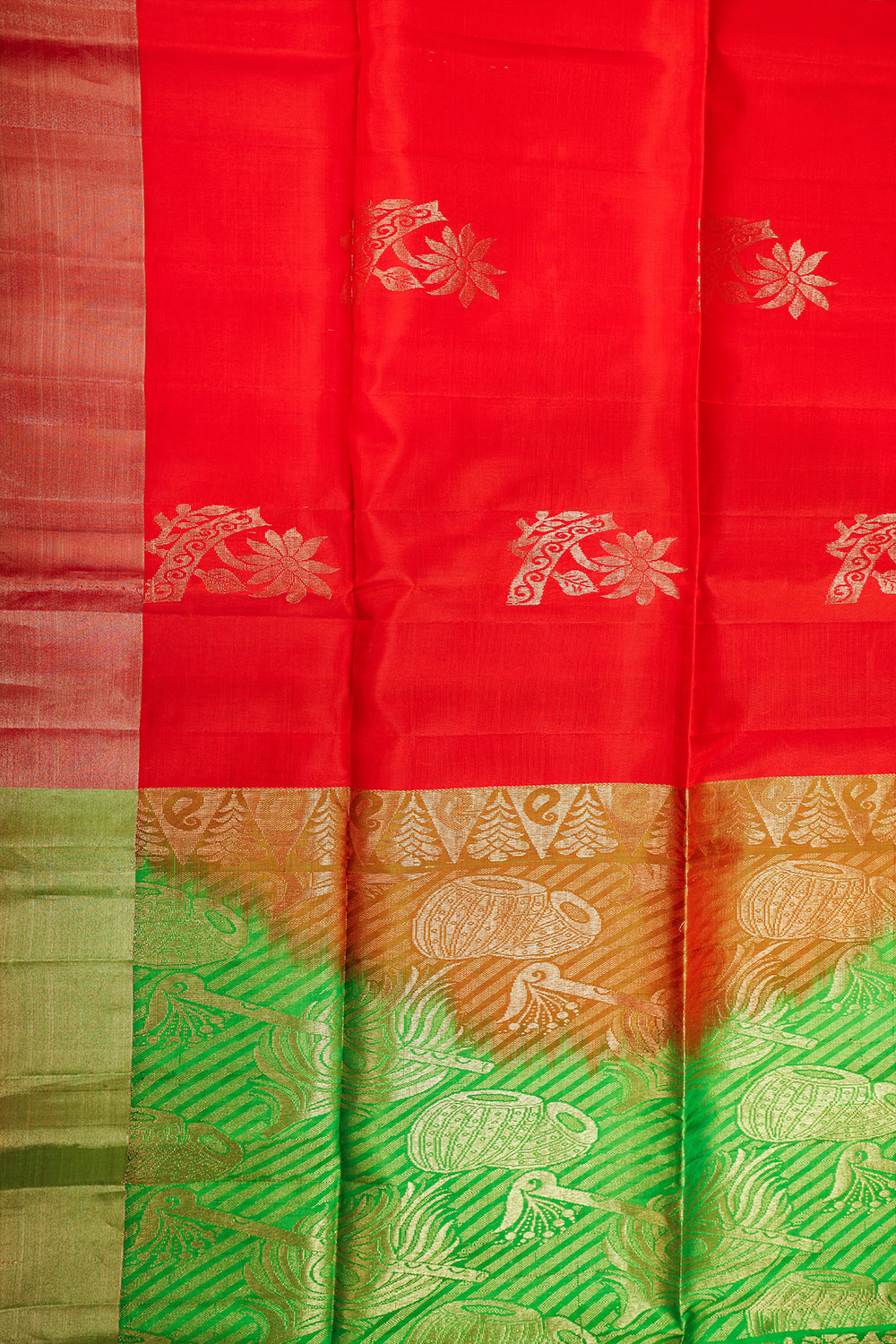 Orange with Green Soft Silk Saree having a beautiful floral motifs all over the body with zigzag gopuram pattern contrast green pallu unstitched blouse attached