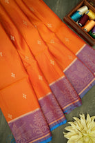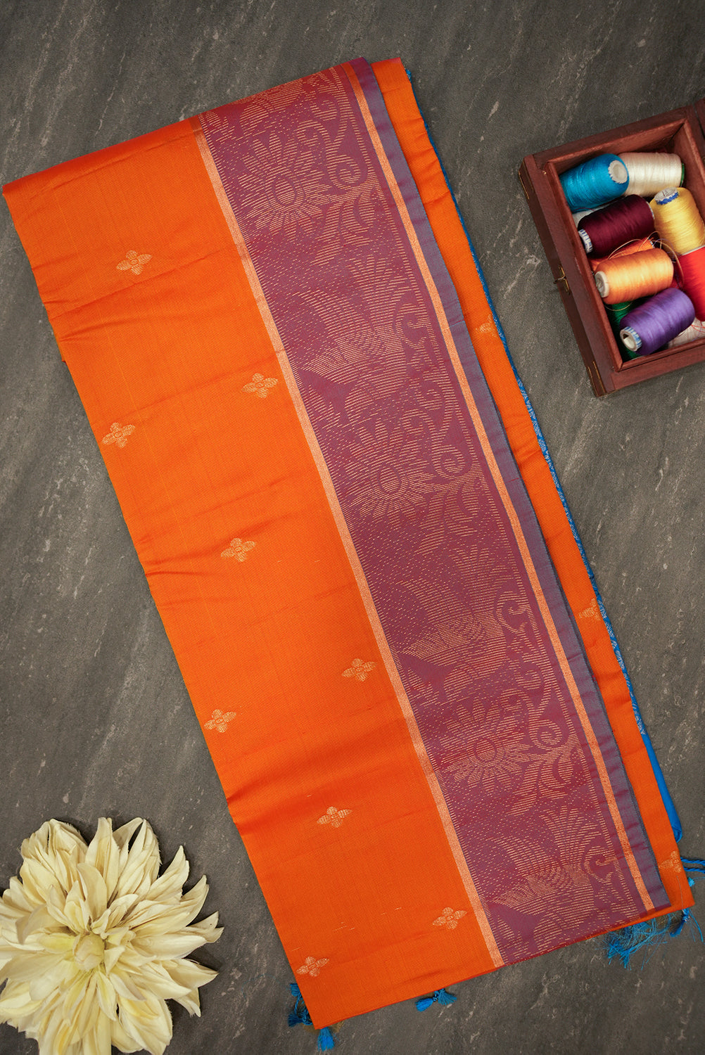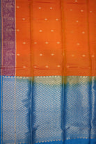 This striking handloom soft silk saree features a vibrant burnt orange body with small, woven floral motifs. The saree is beautifully contrasted by a rich purple pallu and border, which are adorned with intricate floral and paisley patterns. A delicate royal blue piping along the edge adds a final pop of color to this elegant drape.