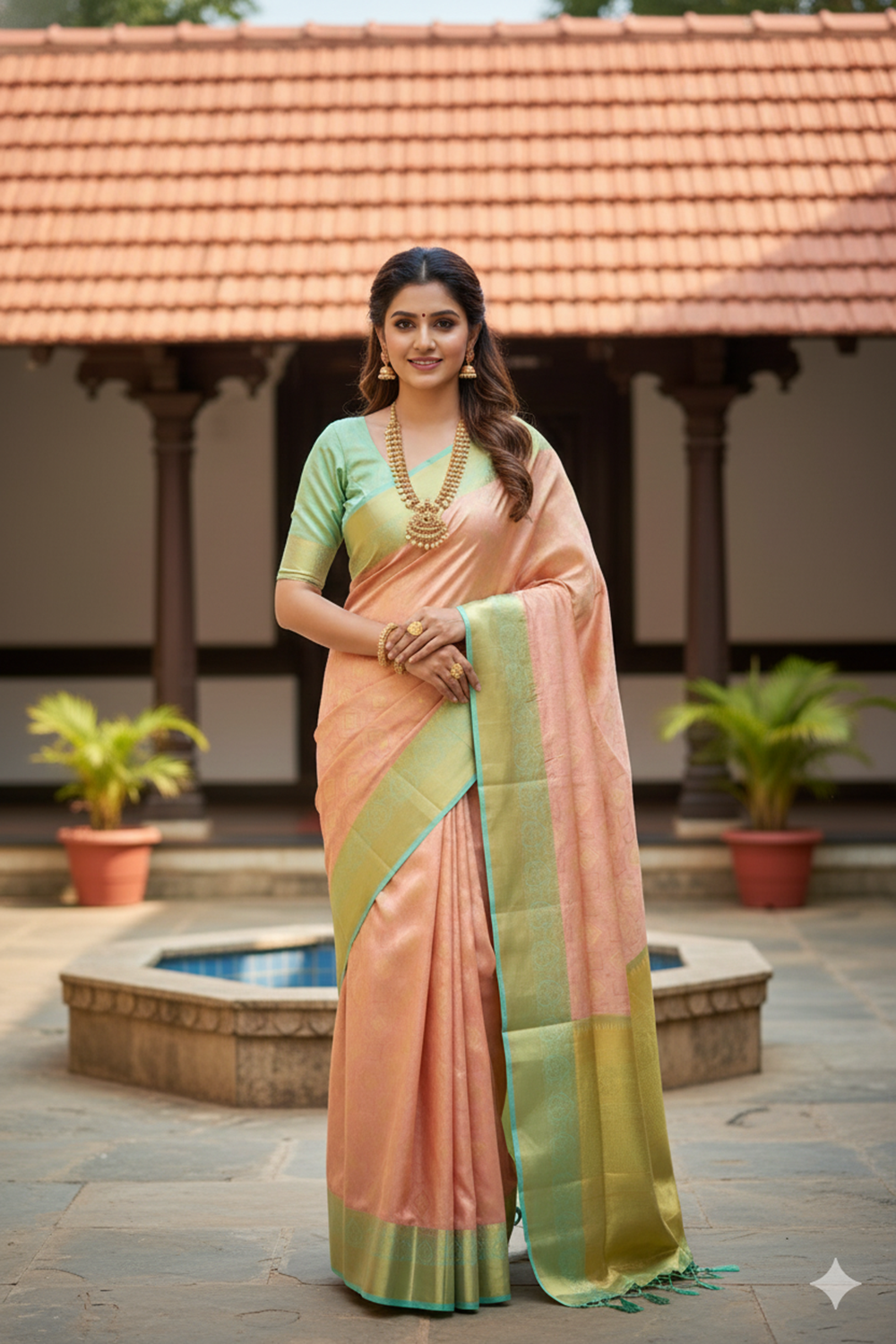 Embrace timeless elegance with this stunning silk saree. The body shimmers in a sophisticated peach-pink or blush pink, woven with subtle golden zari. It is beautifully contrasted by a vibrant pistachio green border, featuring intricate traditional motifs. Unstitched blouse attached.