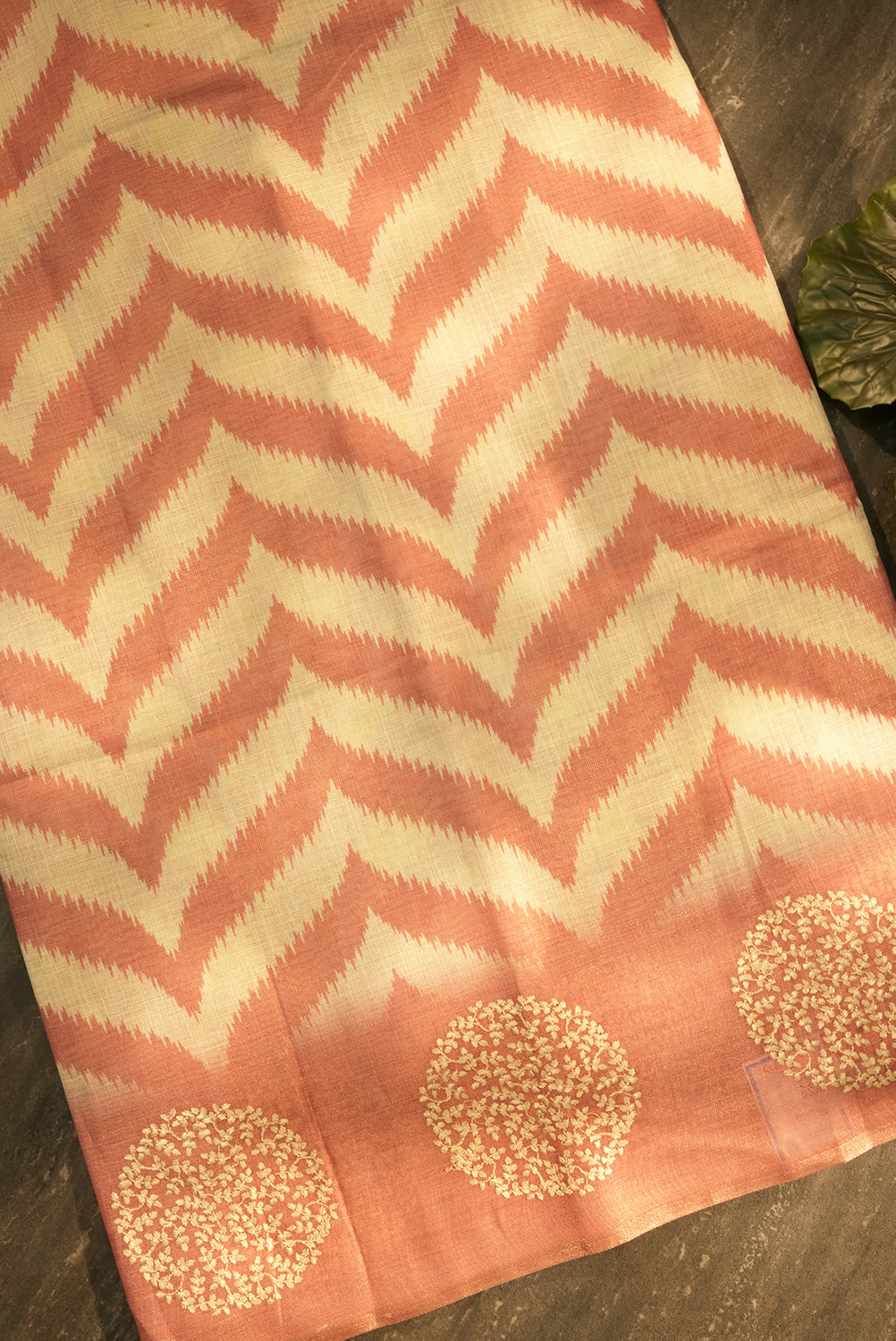 A chic and airy tissue linen saree in a beautiful rose-pink and cream combination. Its standout feature is the bold chevron pattern, paired with elegant medallion motifs. Unstitched blouse attached.