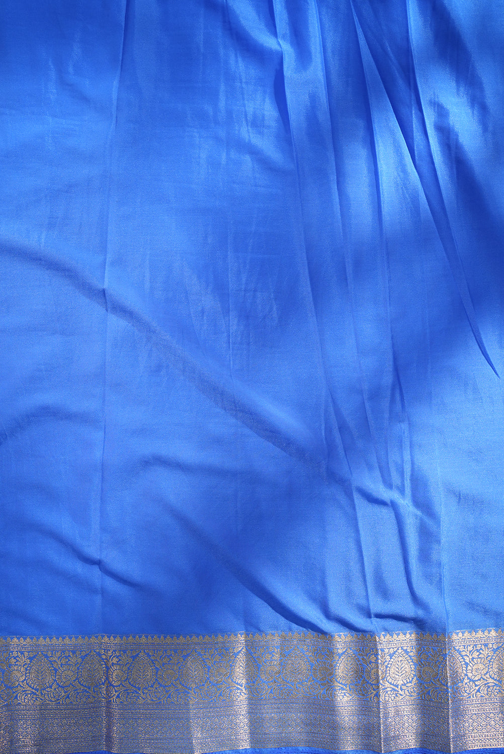 Radiate elegance in this vibrant royal blue Banarasi saree. The body is adorned with shimmering silver zari vertical stripes and delicate floral motifs, finished with an intricately woven floral border for a timeless traditional look. Unstitched blouse attached.