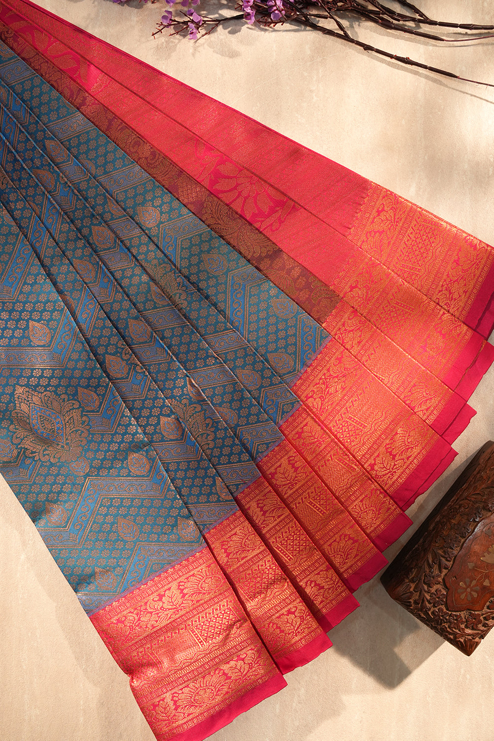 A luxurious teal blue body adorned with intricate gold zari chevron and paisley motifs. The look is beautifully contrasted by a vibrant coral-pink pallu featuring dense, traditional floral weaving. Unstitched blouse attached.