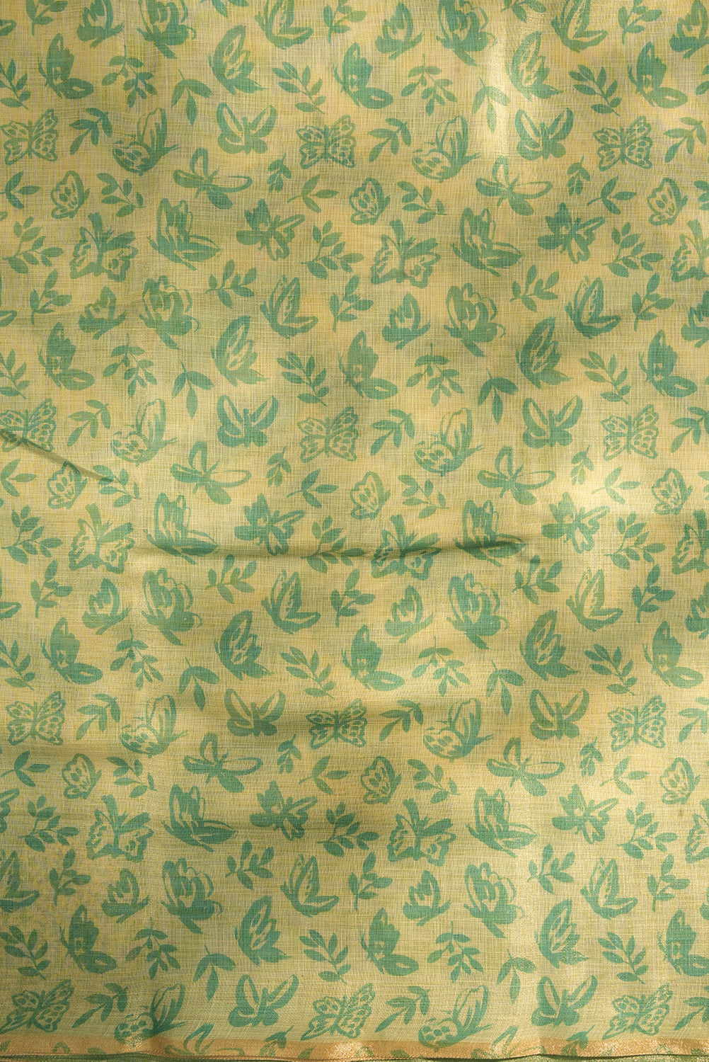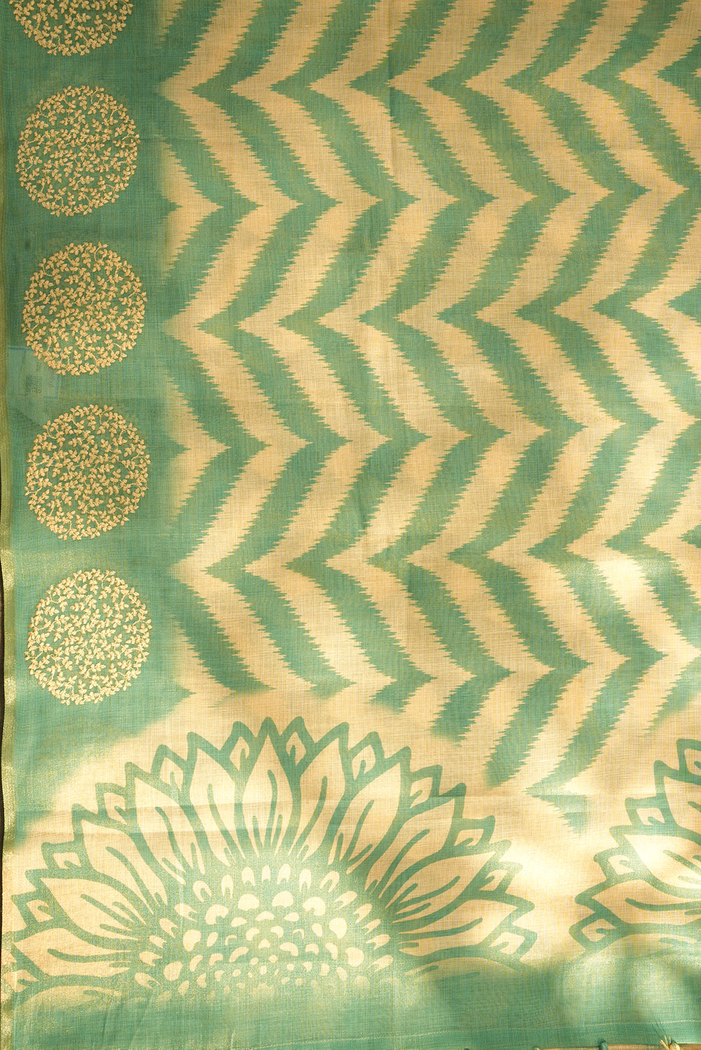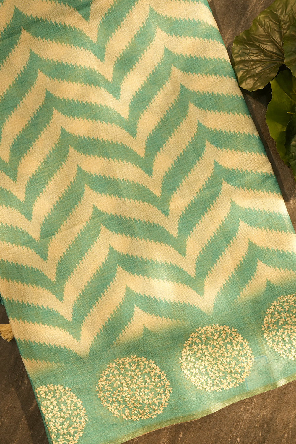 A stunning tissue linen saree featuring a contemporary chevron (zigzag) pattern in a refreshing sea green and elegant cream. The pallu is beautifully adorned with large, woven circular motifs and finished with matching tassels. Unstitched blouse attached.