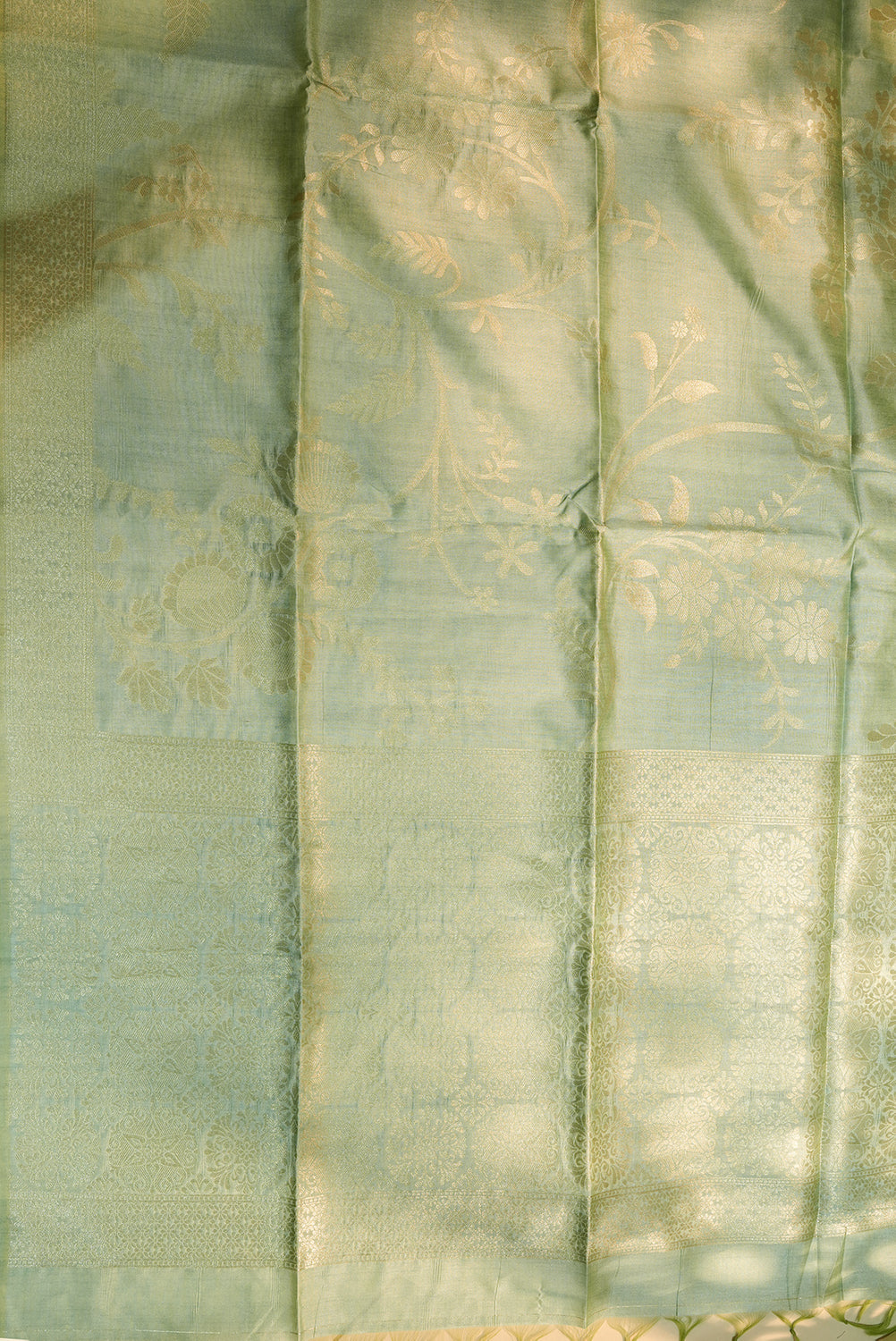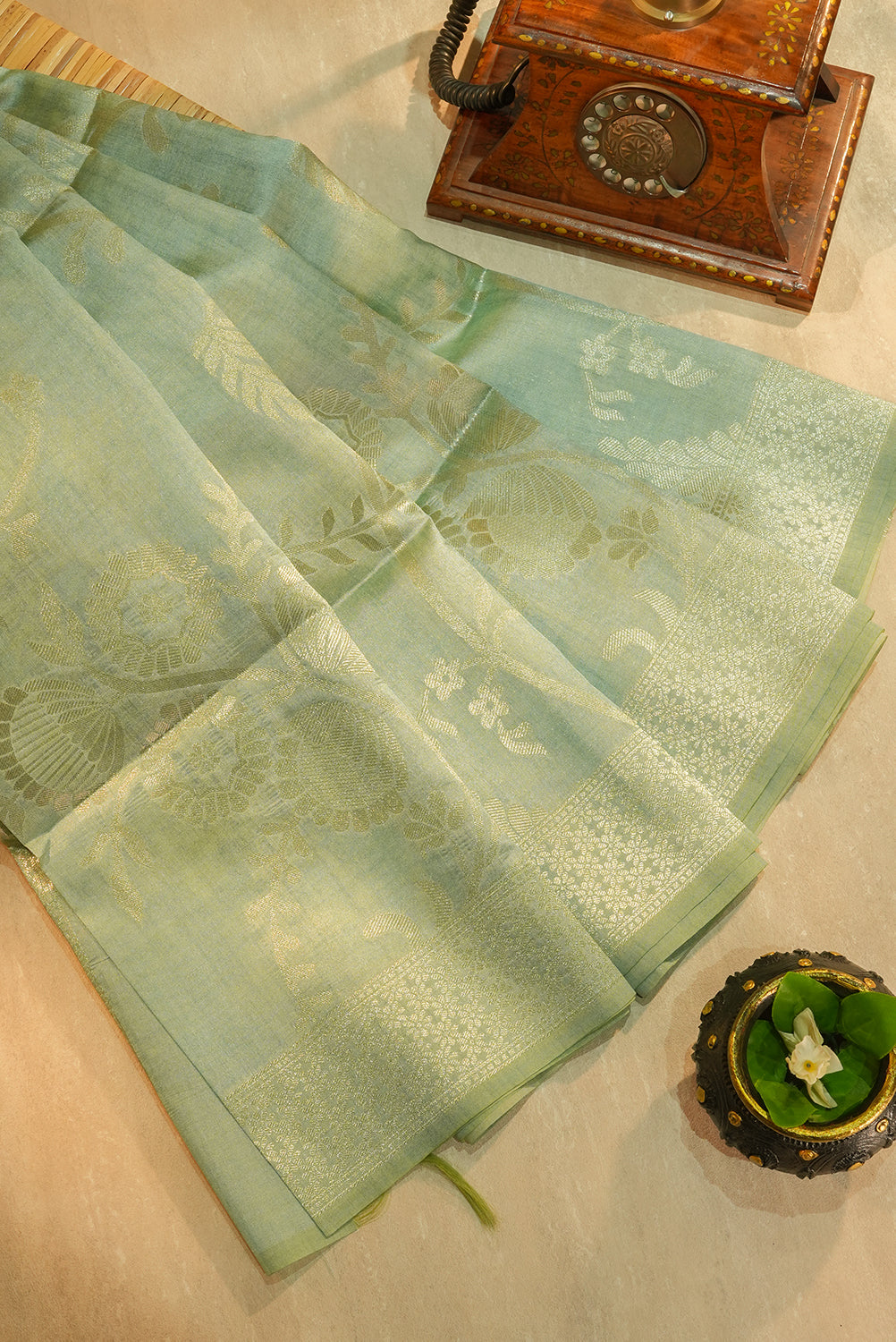 Seafoam Green Raw Silk Saree with Intricate Silver Zari Florals