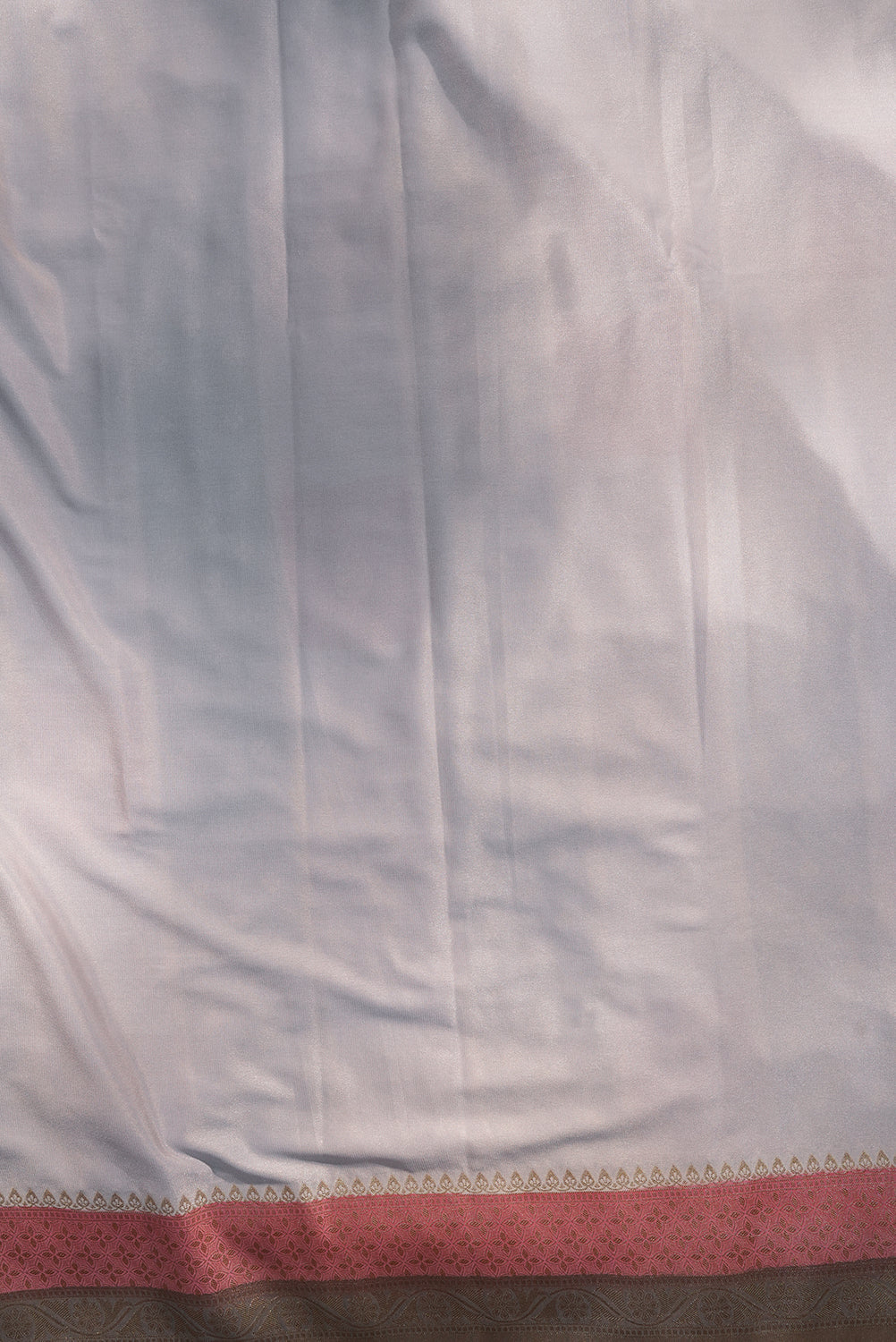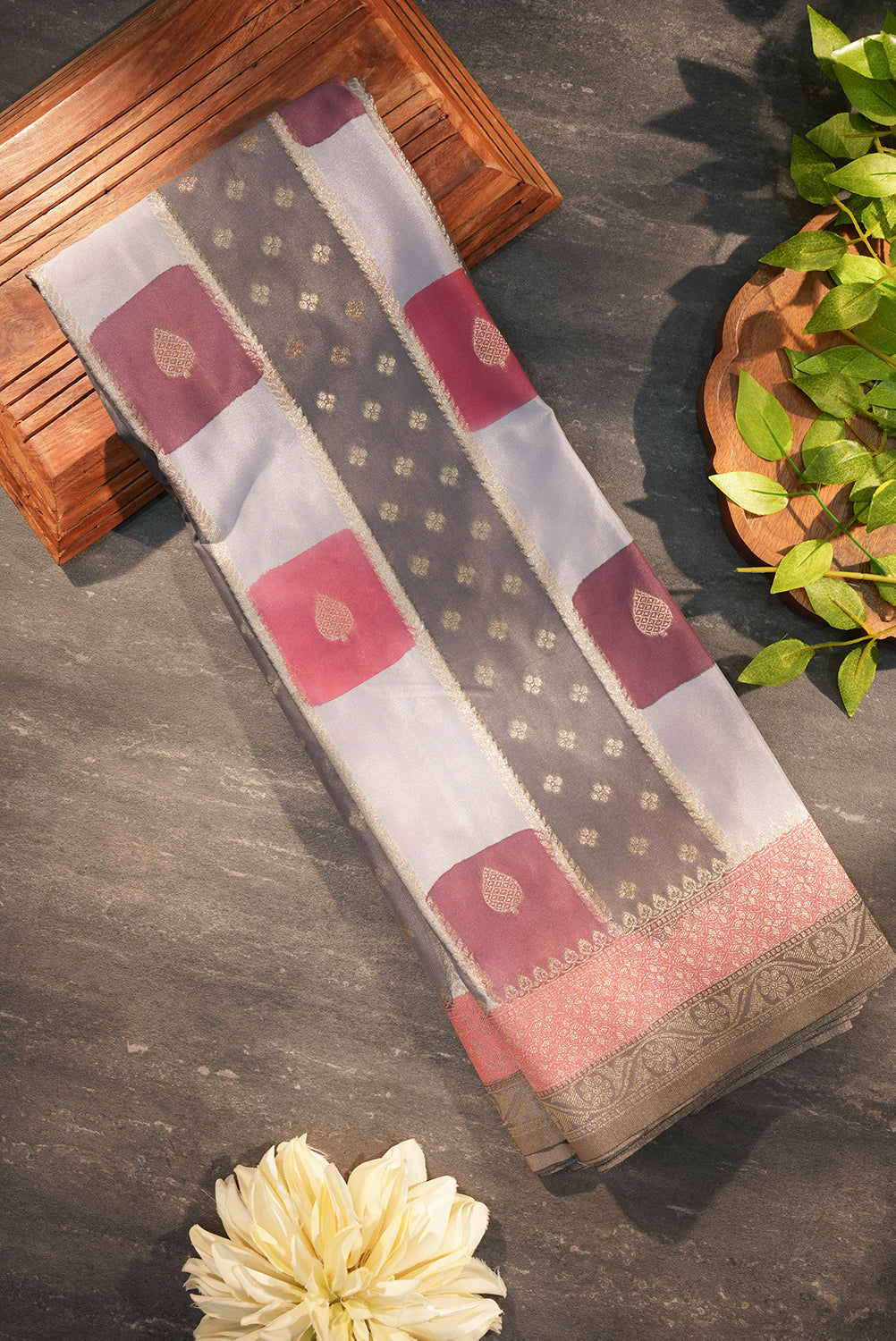 A stunning blend of modern design and traditional weaving. This Banarasi saree features a sophisticated silver-grey base patterned with geometric blocks in shades of deep wine and dusty pink. It is elegantly finished with antique gold zari leaf motifs and a rich floral border. Unstitched blouse attached.