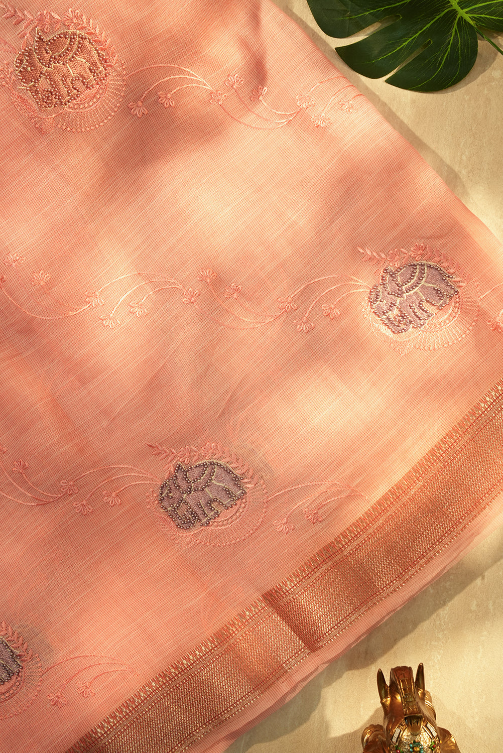 This beautiful, lightweight organza saree features a soft pink body with delicate floral embroidery. It is highlighted by a wide, shimmering gold zari pallu and a unique woven elephant motif. Unstitched blouse attached.