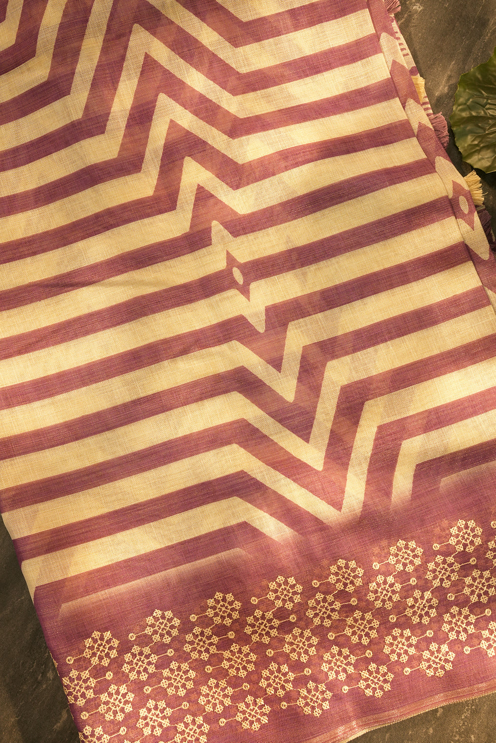 This beautiful saree features a striped body in a soft lavender and cream combination. The highlight is its chevron pattern, which elegantly separates the stripes from the solid lavender border adorned with intricate cream-colored weaving. Unstiched blouse attached.