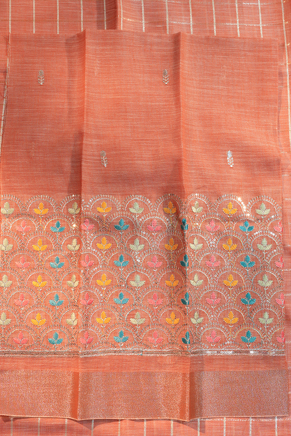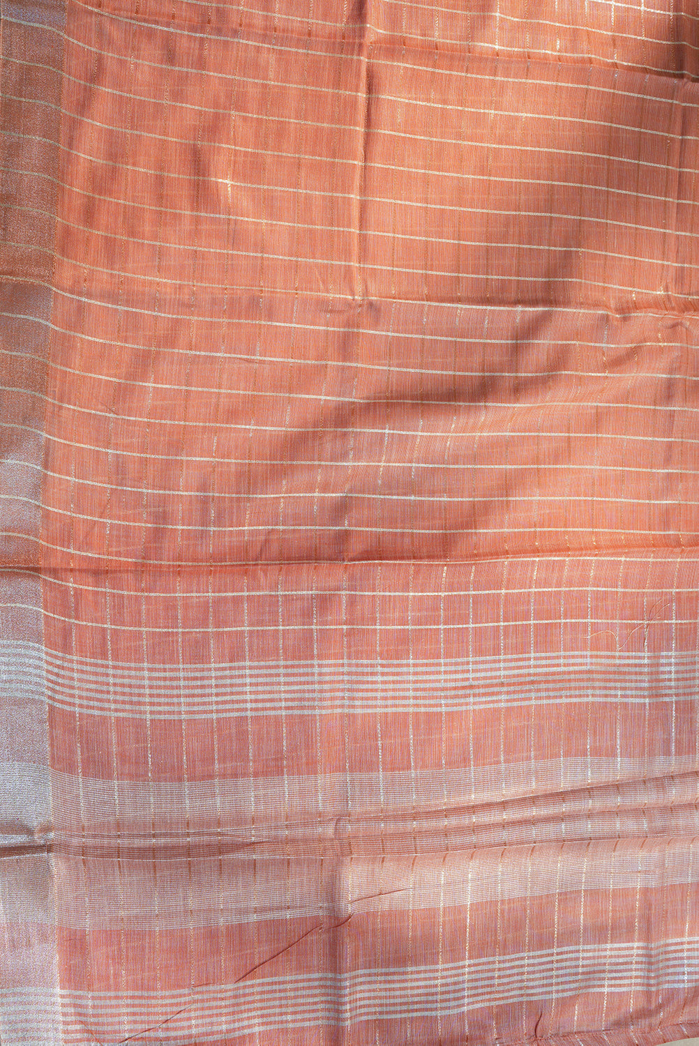 A sophisticated linen saree in an orange hue, featuring a refined grid of silver zari checks. The border is finished with a shimmering silver band, making it an ideal choice for both office wear and daytime gatherings. Unstitched blouse attached.