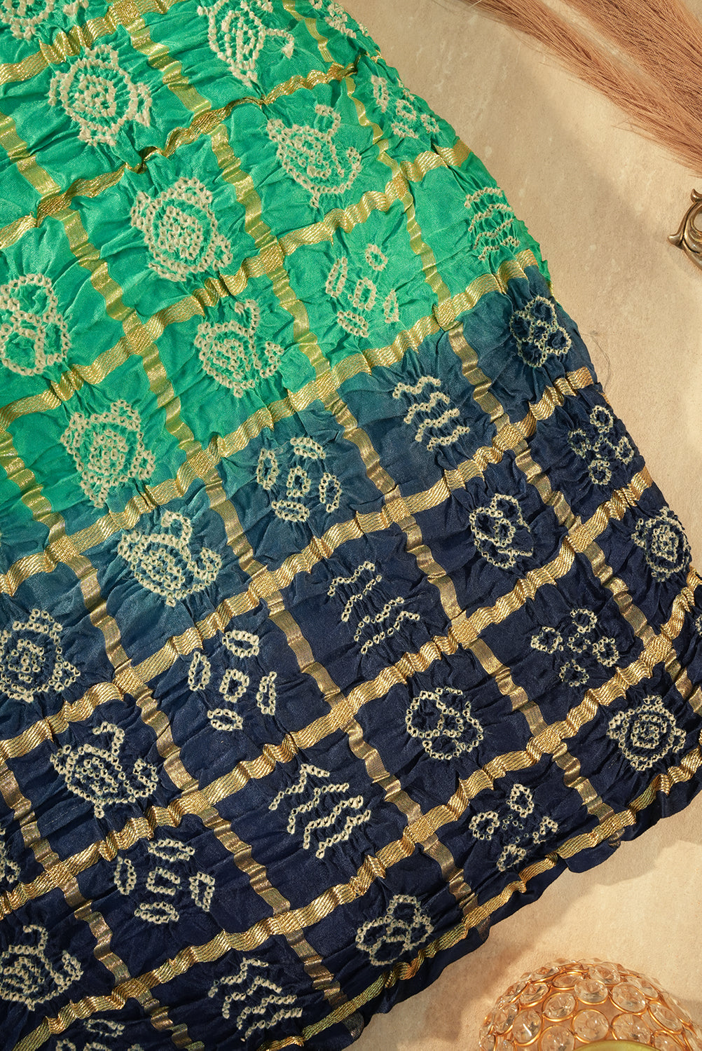This is a classic and opulent Bandhani (Banthini) saree, designed in a traditional Gharchola style. The saree features a striking dual-tone or "half-and-half" color combination:The upper half (likely the pallu or shoulder drape) is a vibrant Emerald Green. The lower half (likely the pleats) is a deep Navy Blue. Unstitched blouse attached.