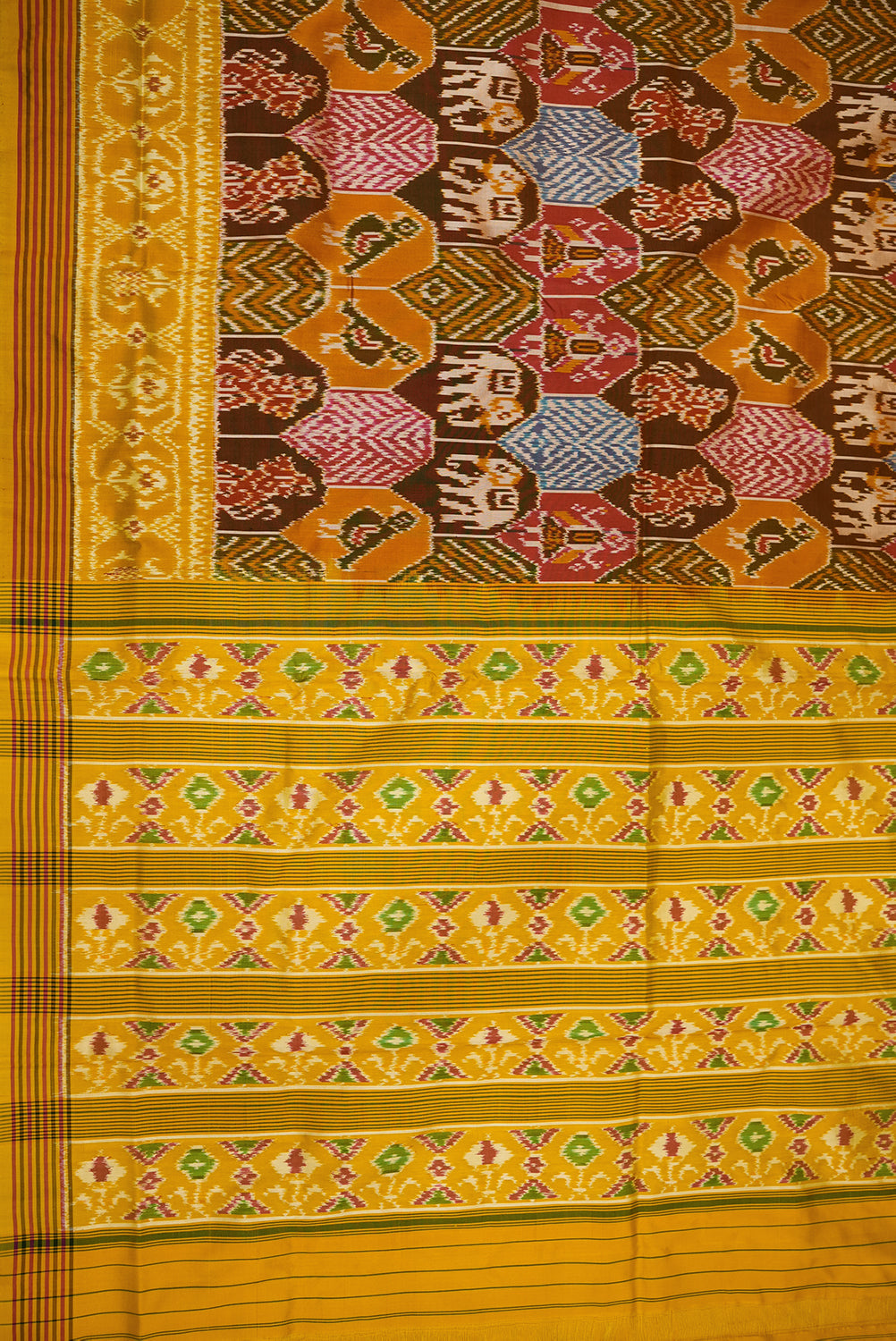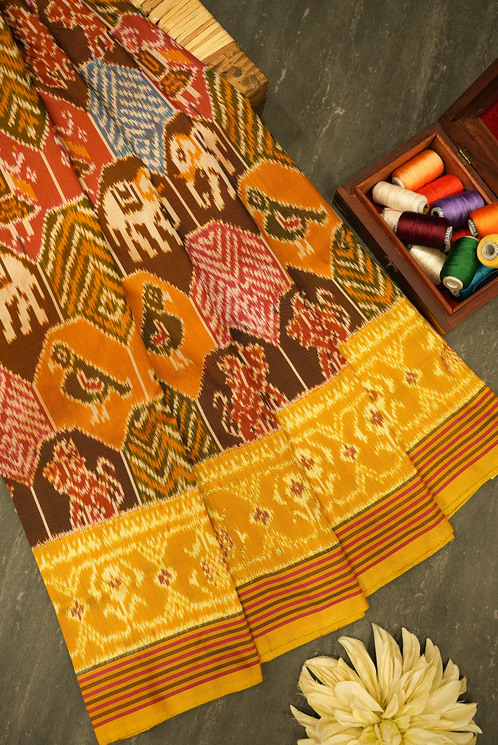 This exquisite Ikat silk saree features a rich, earthy color palette with a vibrant pallu adorned with intricate elephant motifs. The body of the saree is a striking mustard yellow, complemented by a contrast border with fine striped patterns. Unstitched blouse attached.