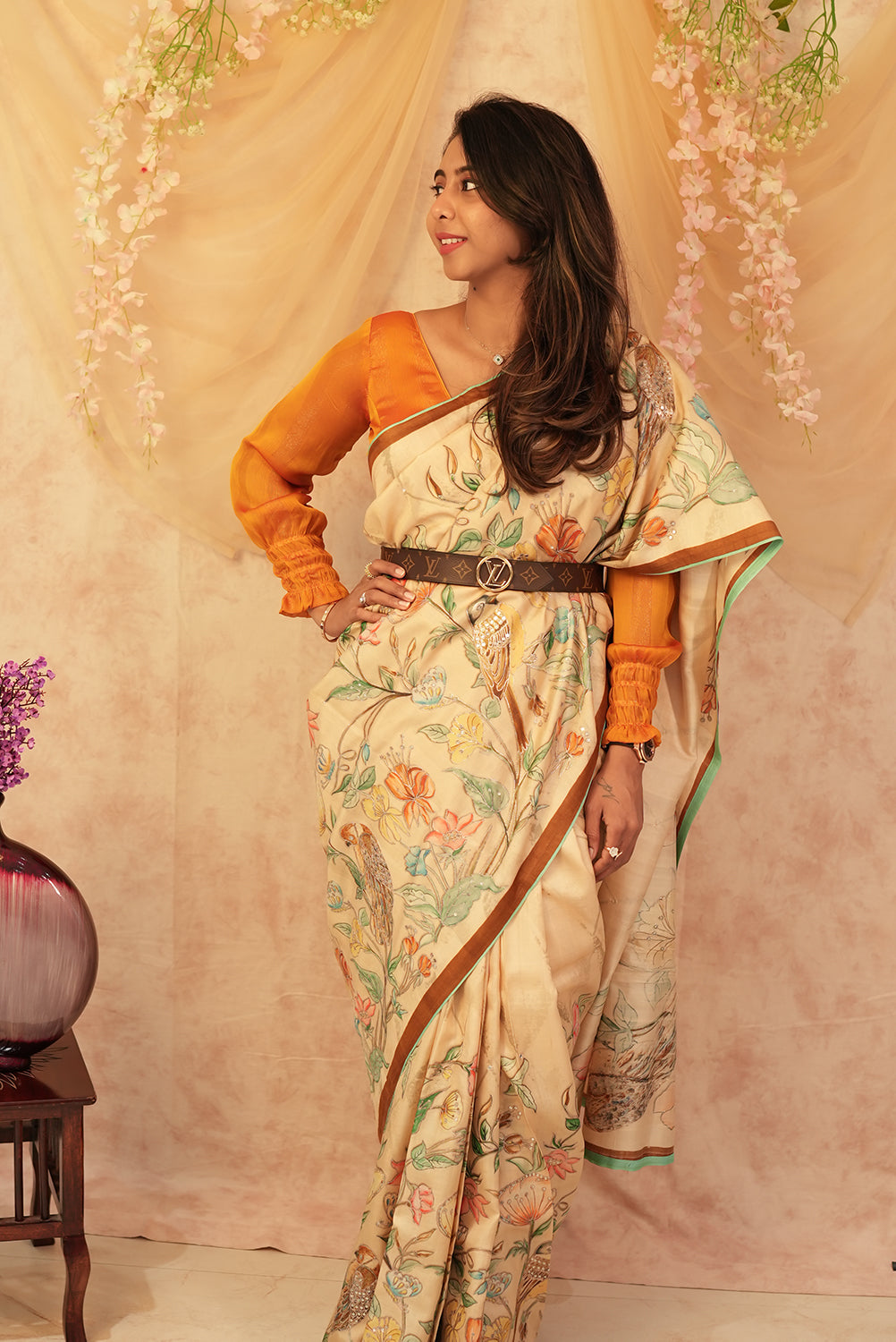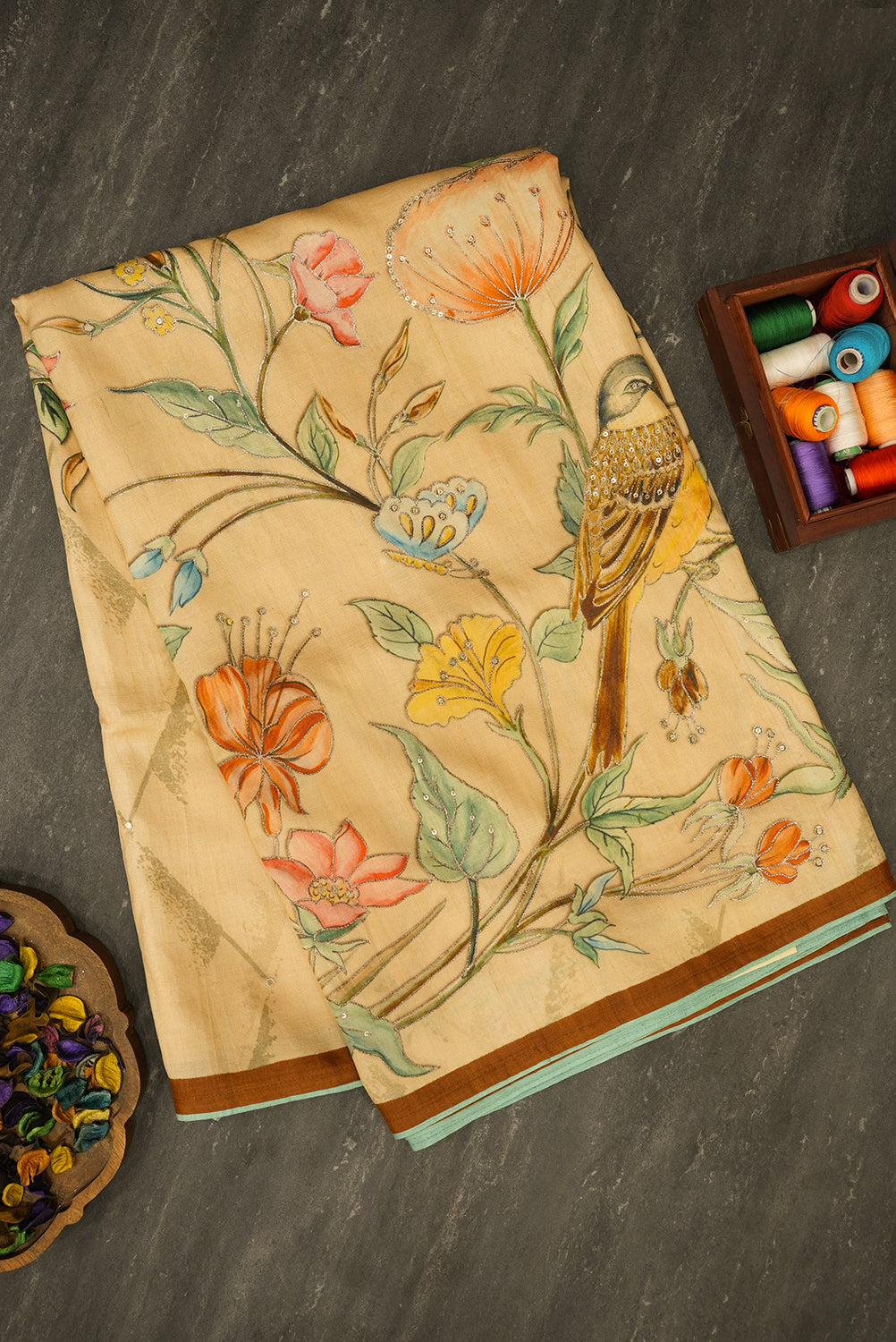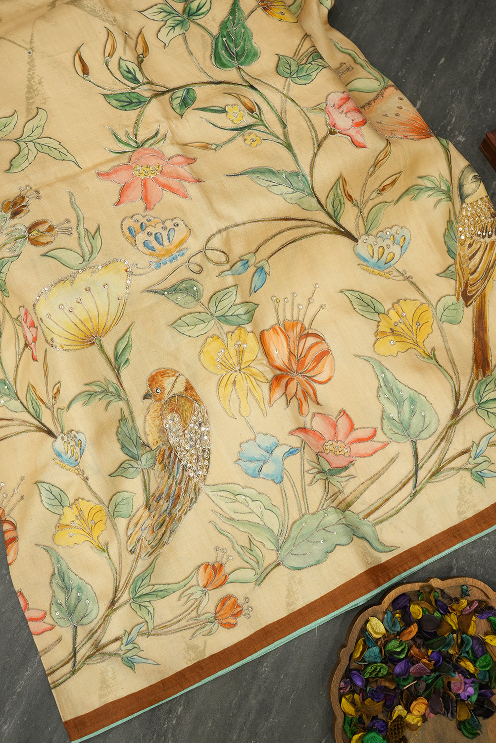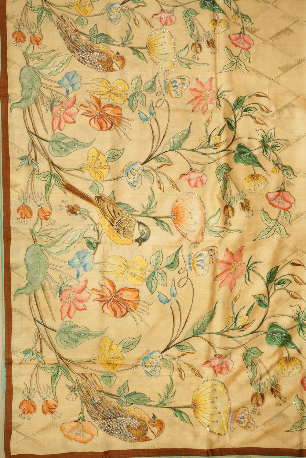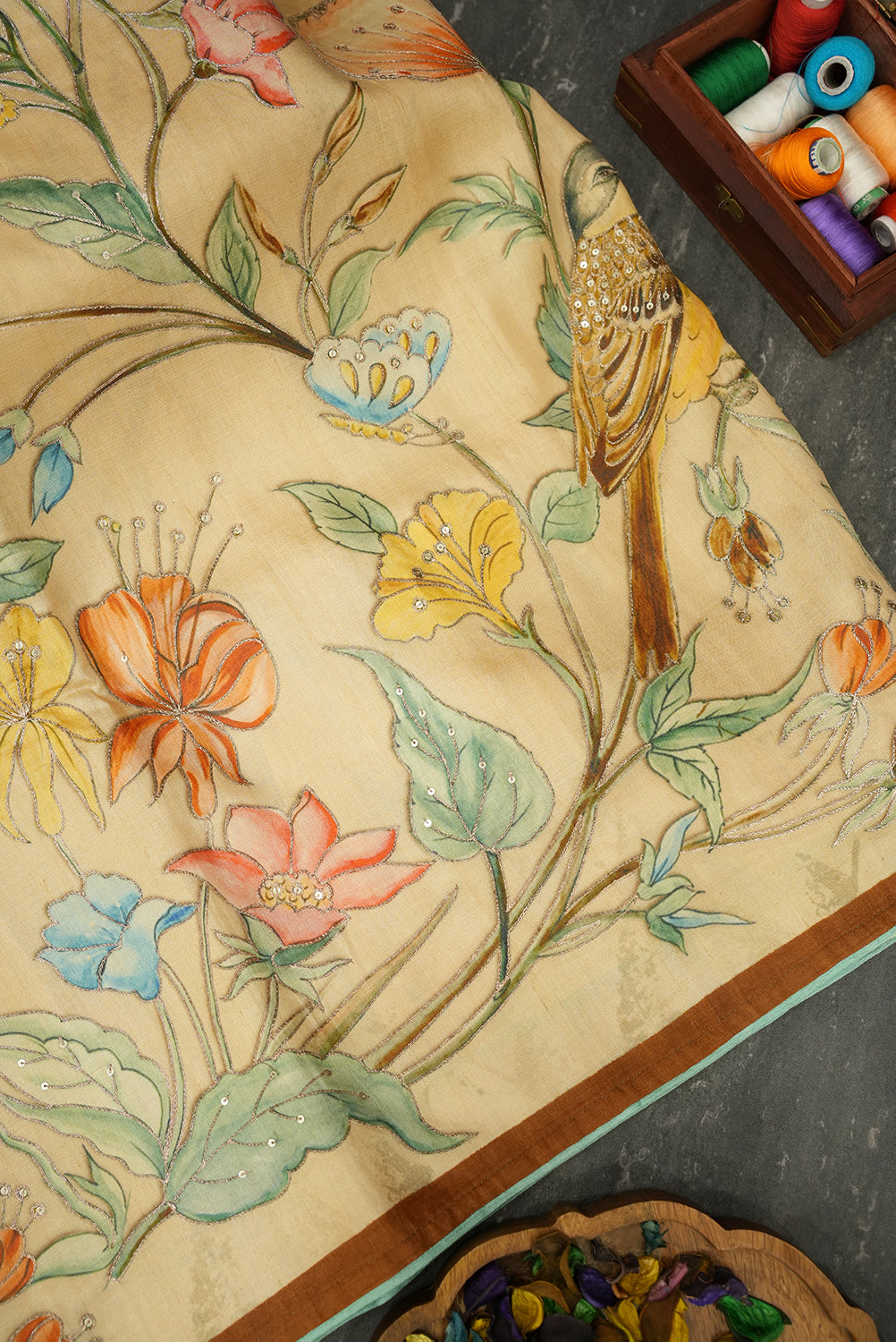 This saree features intricate floral and bird motifs, beautifully embroidered with fine threadwork and embellishments. The color palette includes vibrant shades of orange, pink, yellow, and blue, set against a soft beige background. The floral designs are delicately outlined, with hints of metallic accents that enhance the richness of the embroidery. The birds, with their detailed feathers, add a natural charm to the overall design.With Blouse Attached...