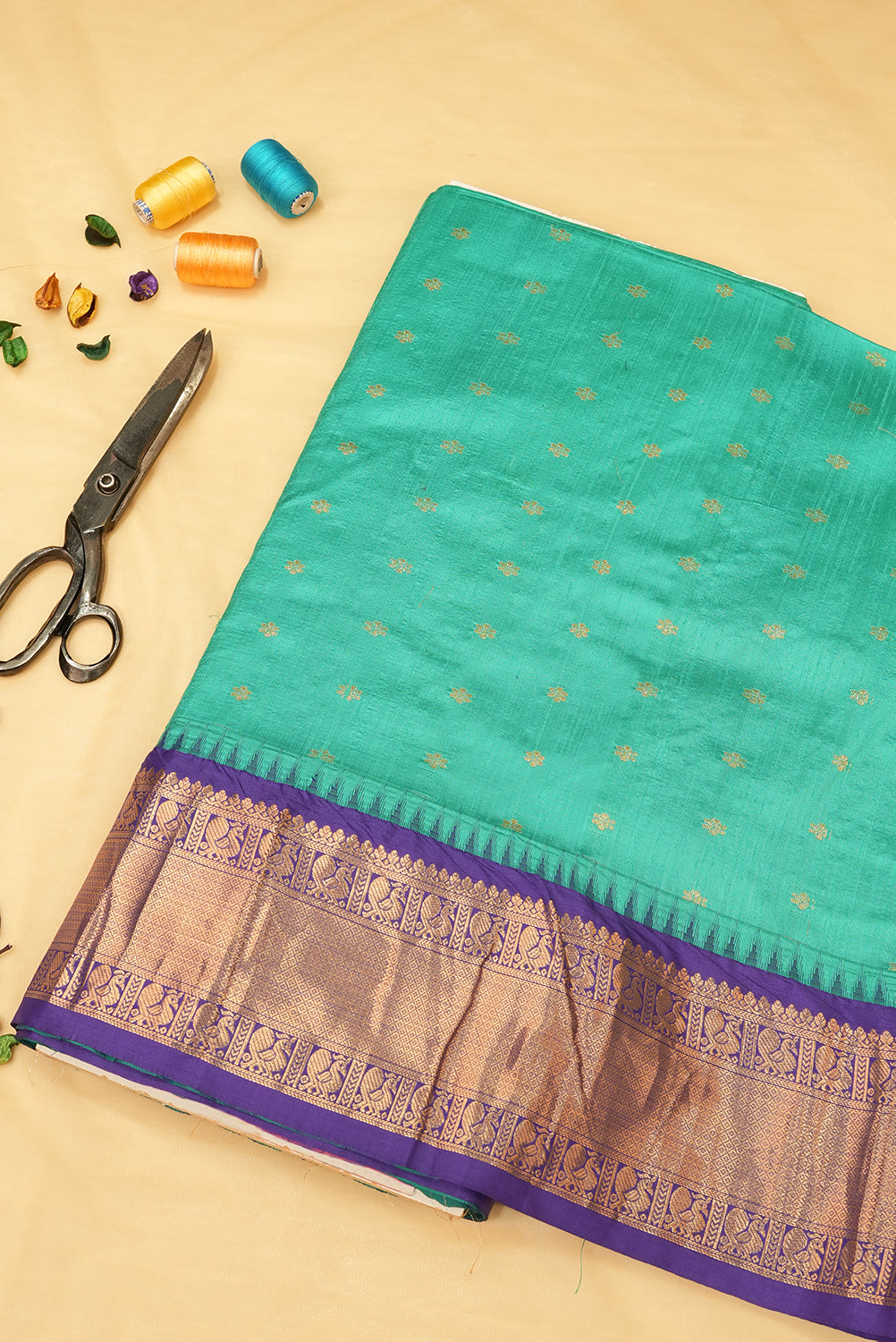 Aqua blue with small ramdom buttas on body with kanjivaram border Fabric