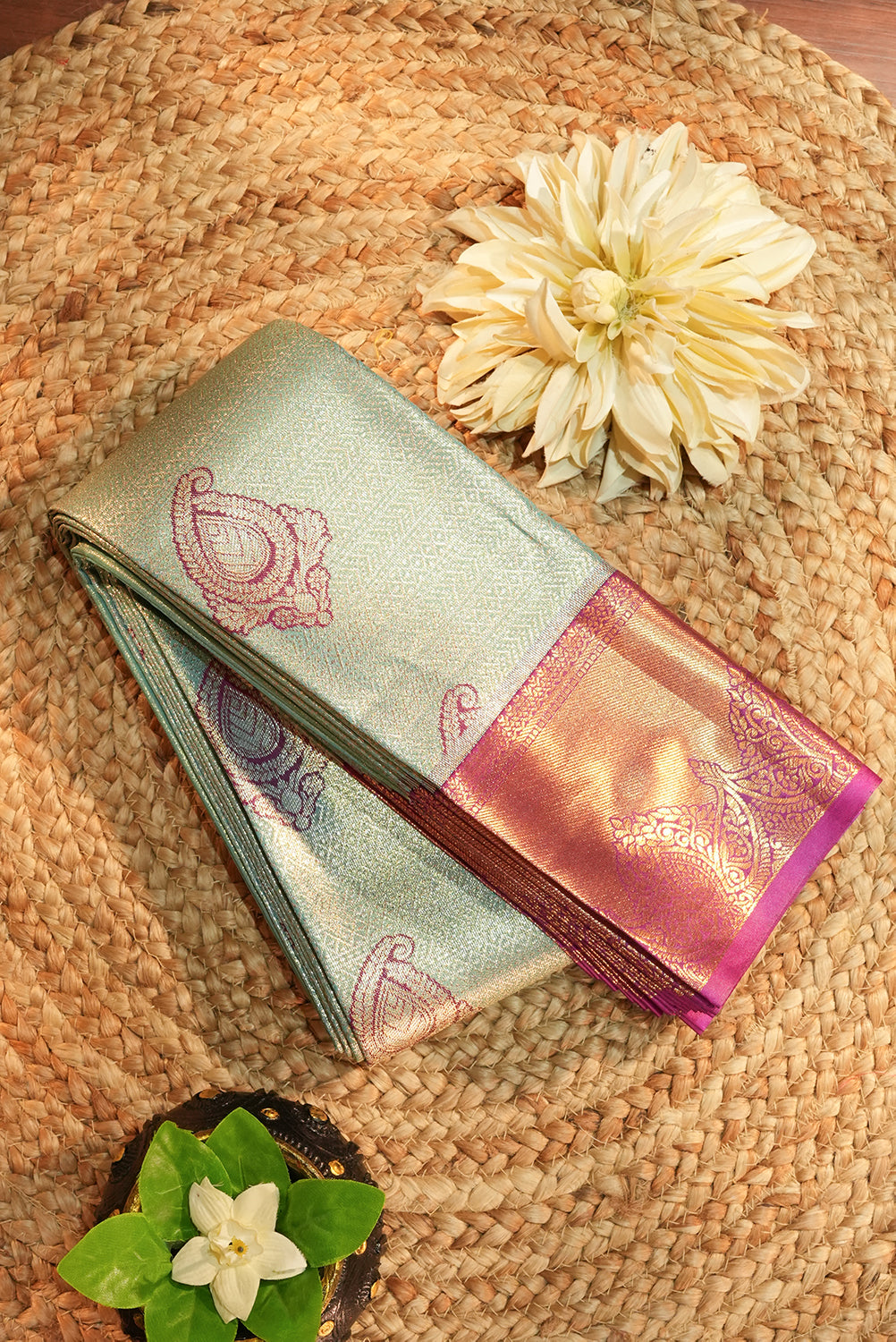 Radiant in its simplicity, this silk saree features a refreshing seafoam green body adorned with intricate paisley motifs. The wide magenta border, enriched with traditional gold zari work, adds a regal touch, making it a perfect choice for weddings and festive celebrations. Unstitched blouse attached.