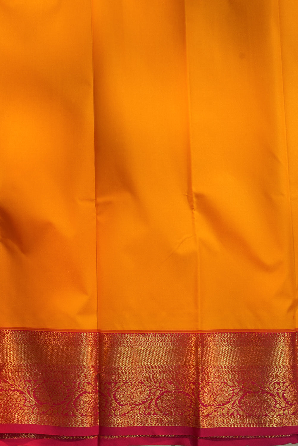 A perfect blend of tradition and vibrance. This saree showcases a glowing deep yellow body paired with a striking Rani pink border. The heavy gold zari floral motifs on the border add a touch of royal grandeur, ensuring you stand out at every event. Unstitched blouse attached.
