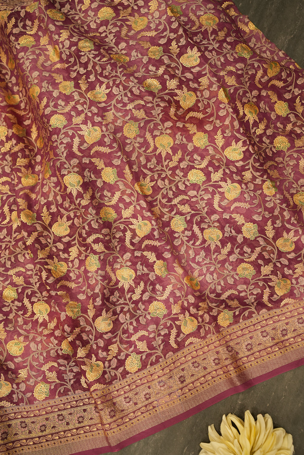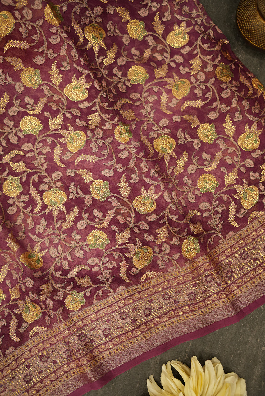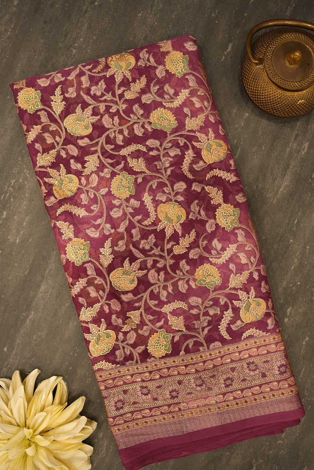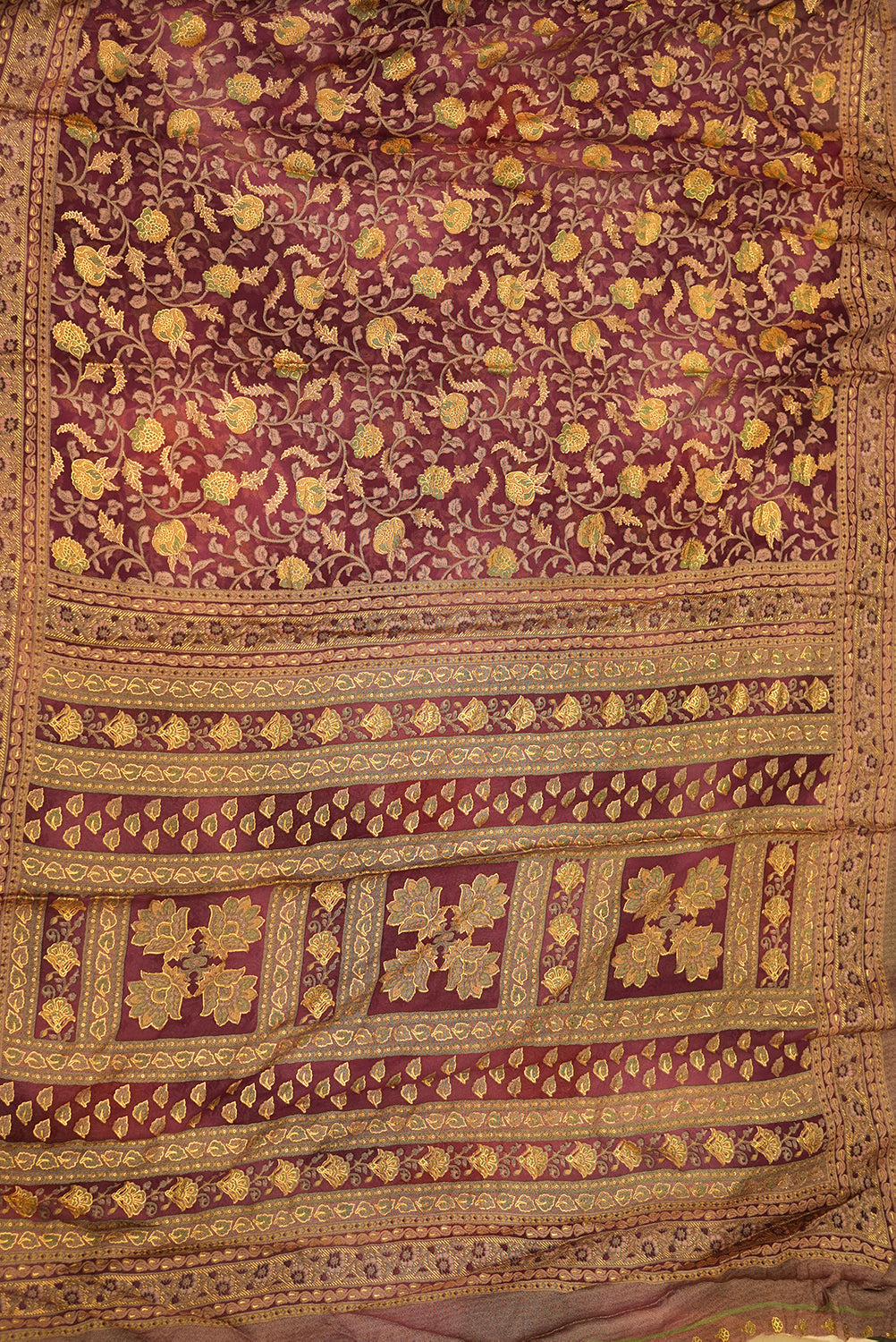 Wine Brocade Saree with Antique Gold Floral Bootas