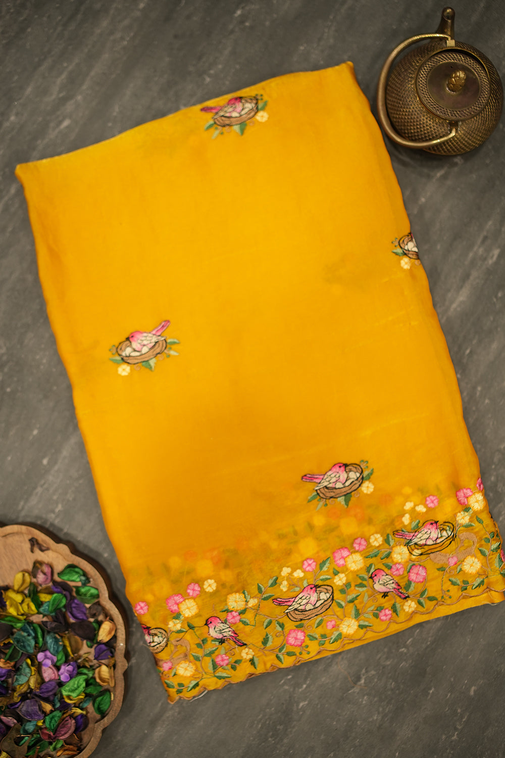 Yellow Designer Saree with Whimsical Bird & Floral Threadwork