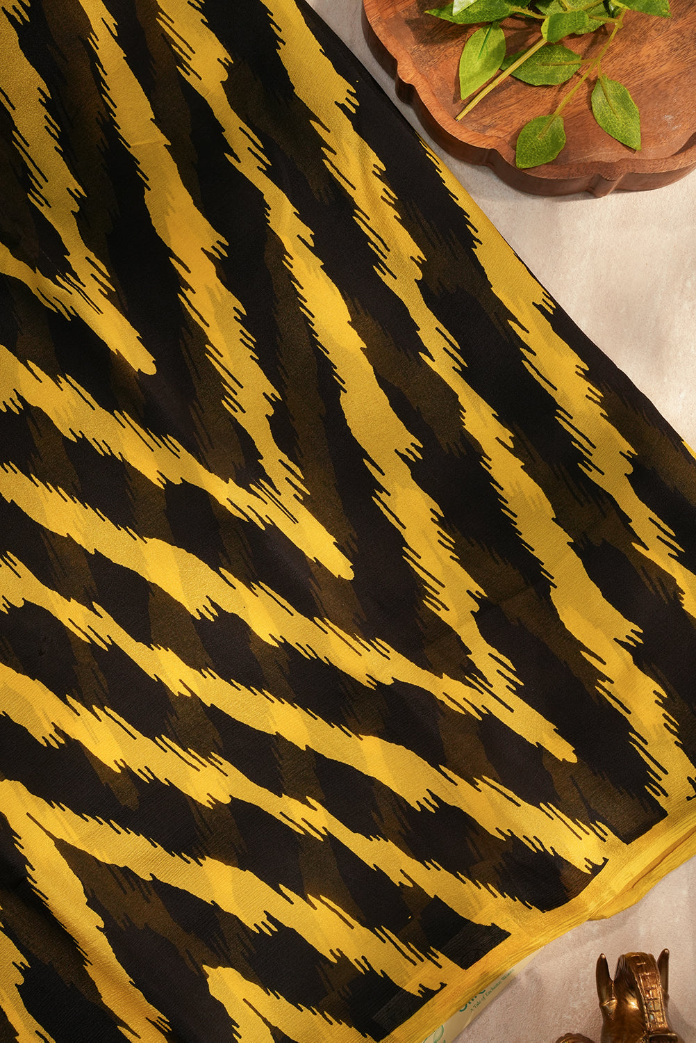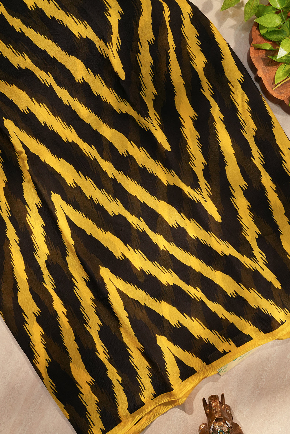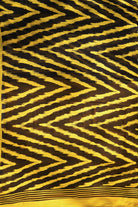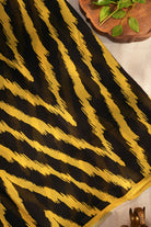 A mesmerizing blend of colors, this saree pairs rich black with an electrifying golden yellow in a sharp, contrasting pattern. Crafted from airy Chiffon, this piece offers a beautiful fall and is ideal for all-day comfort. Unstitched blouse attached.