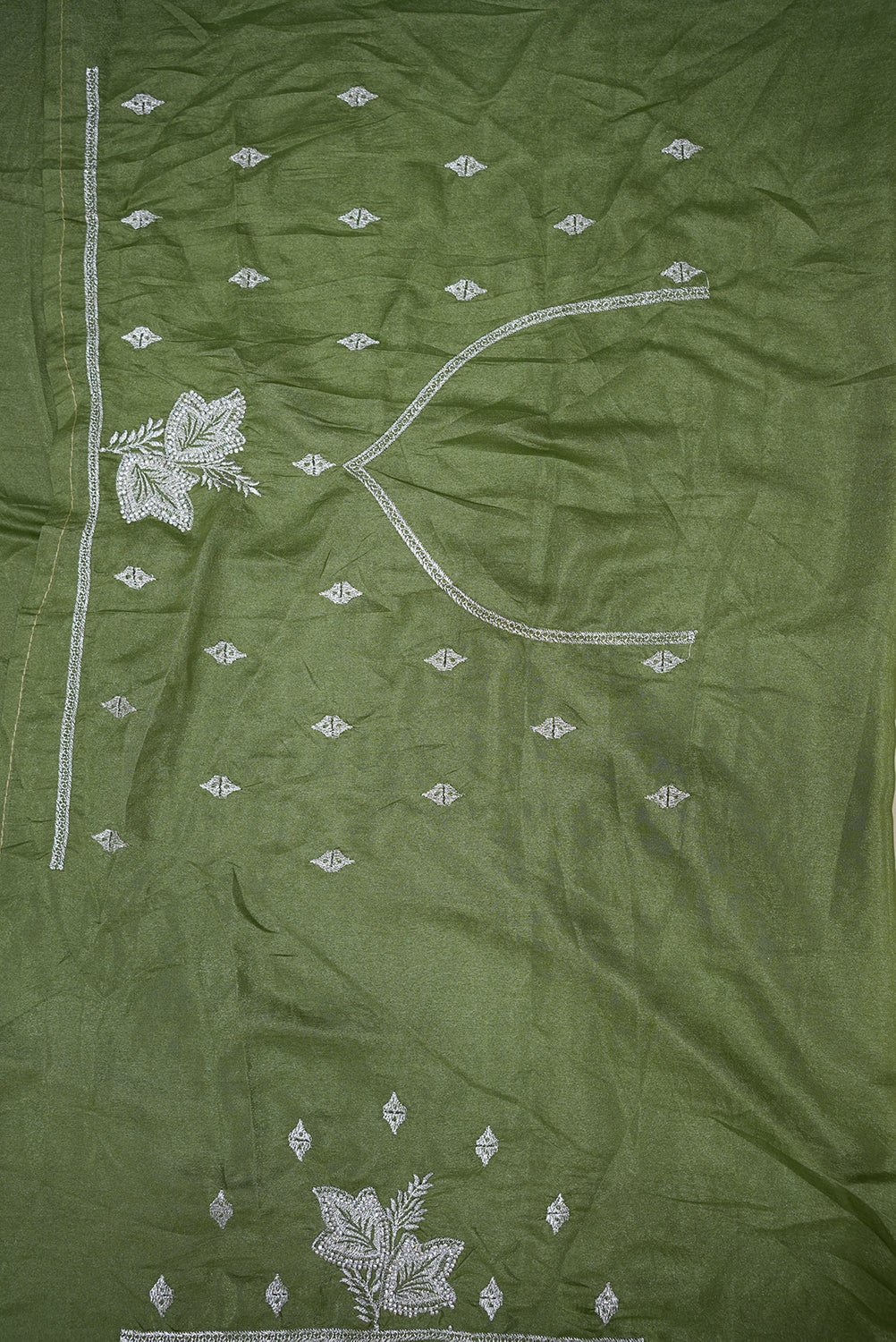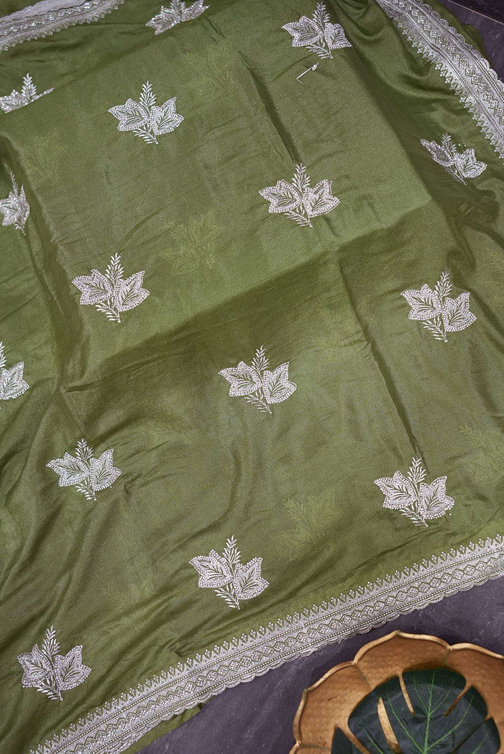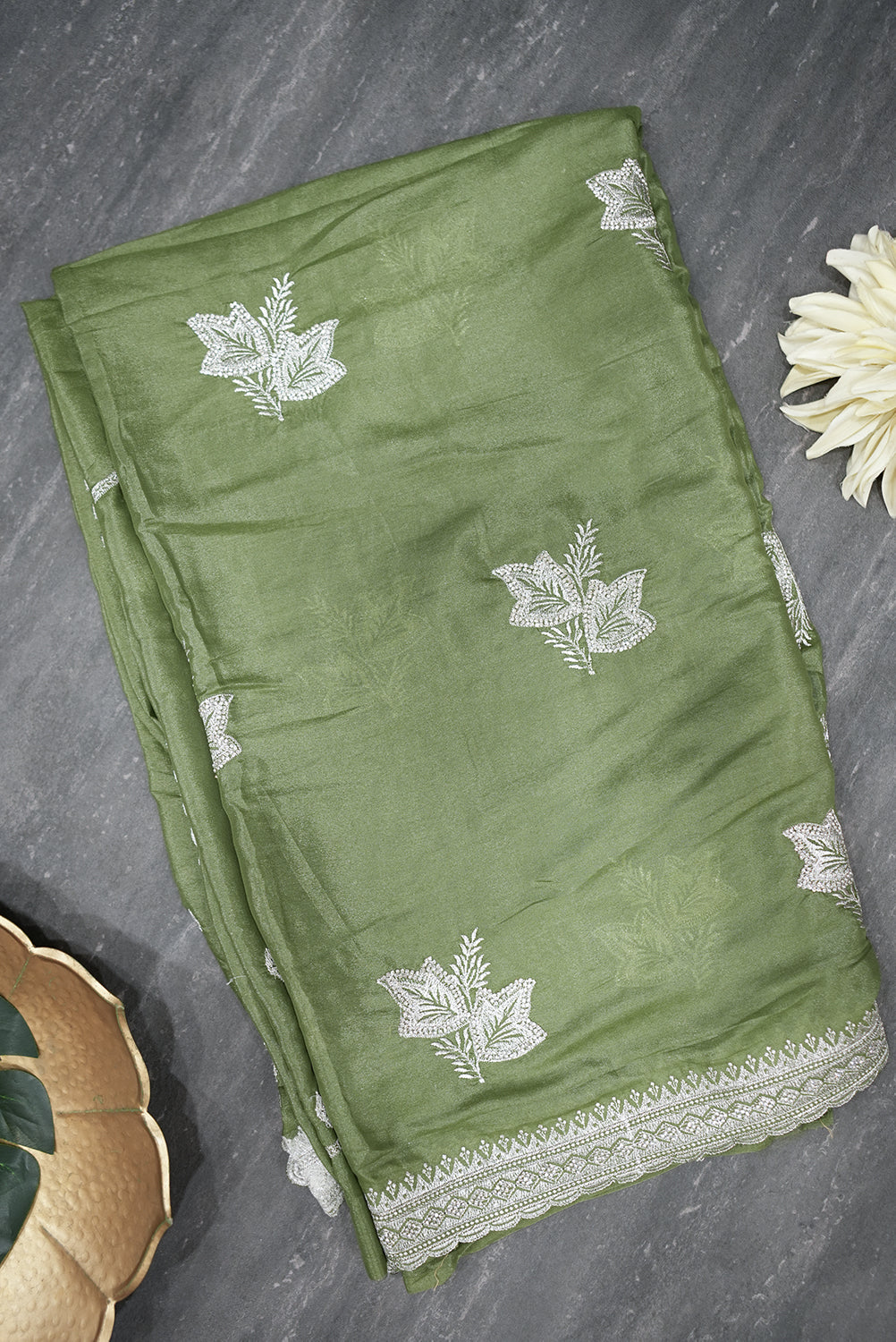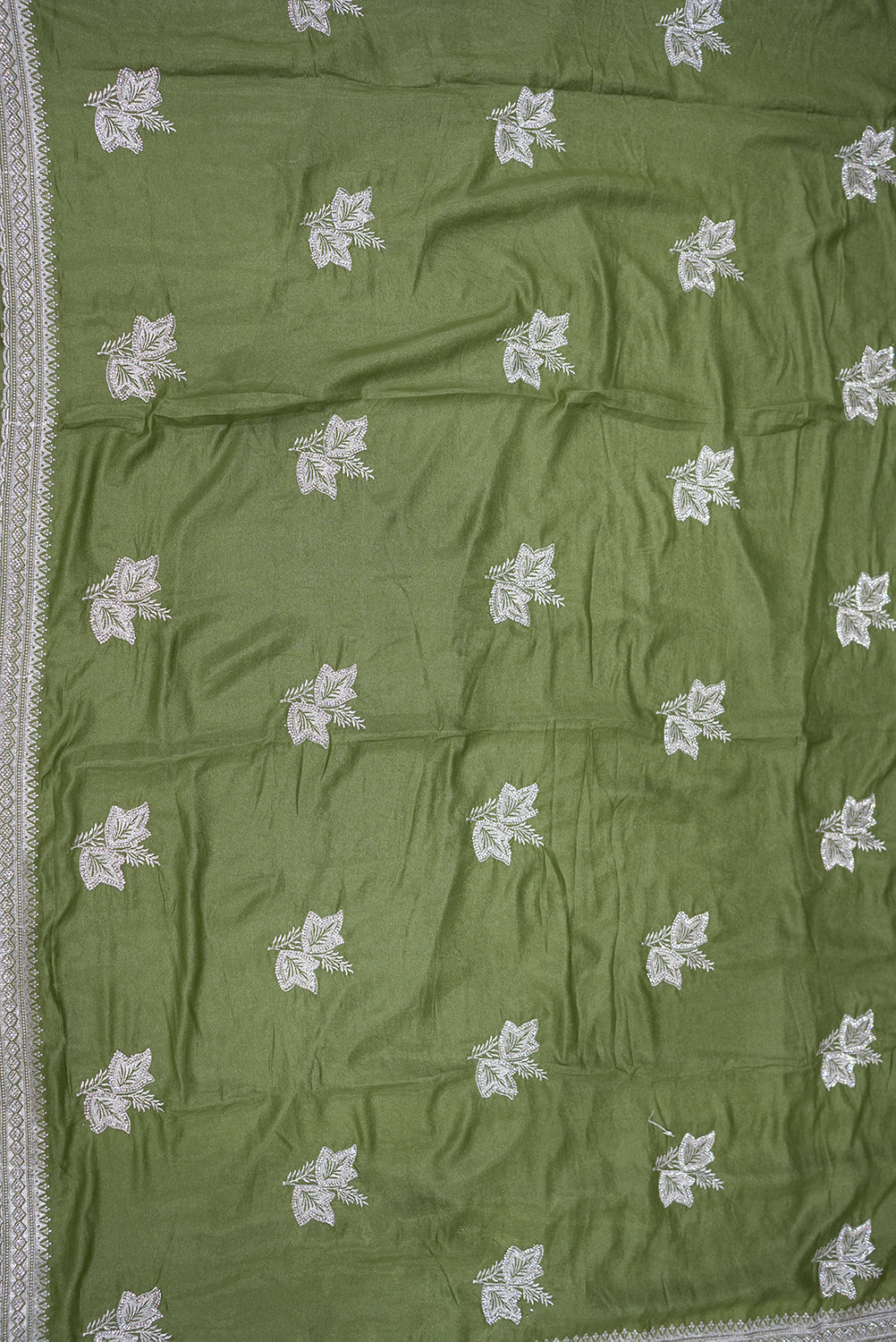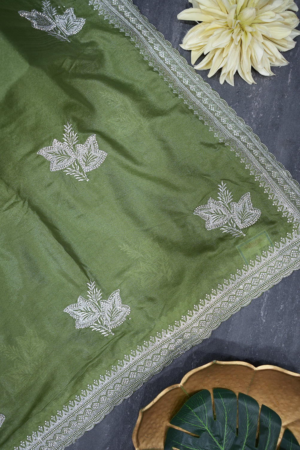 Drape yourself in this stunning green Zimmy Choo saree, featuring a soft silk texture and a subtle shimmer. The saree is adorned with intricate silver embroidery in a delicate leaf pattern. Perfect for any special occasion. Unstitched blouse attached.