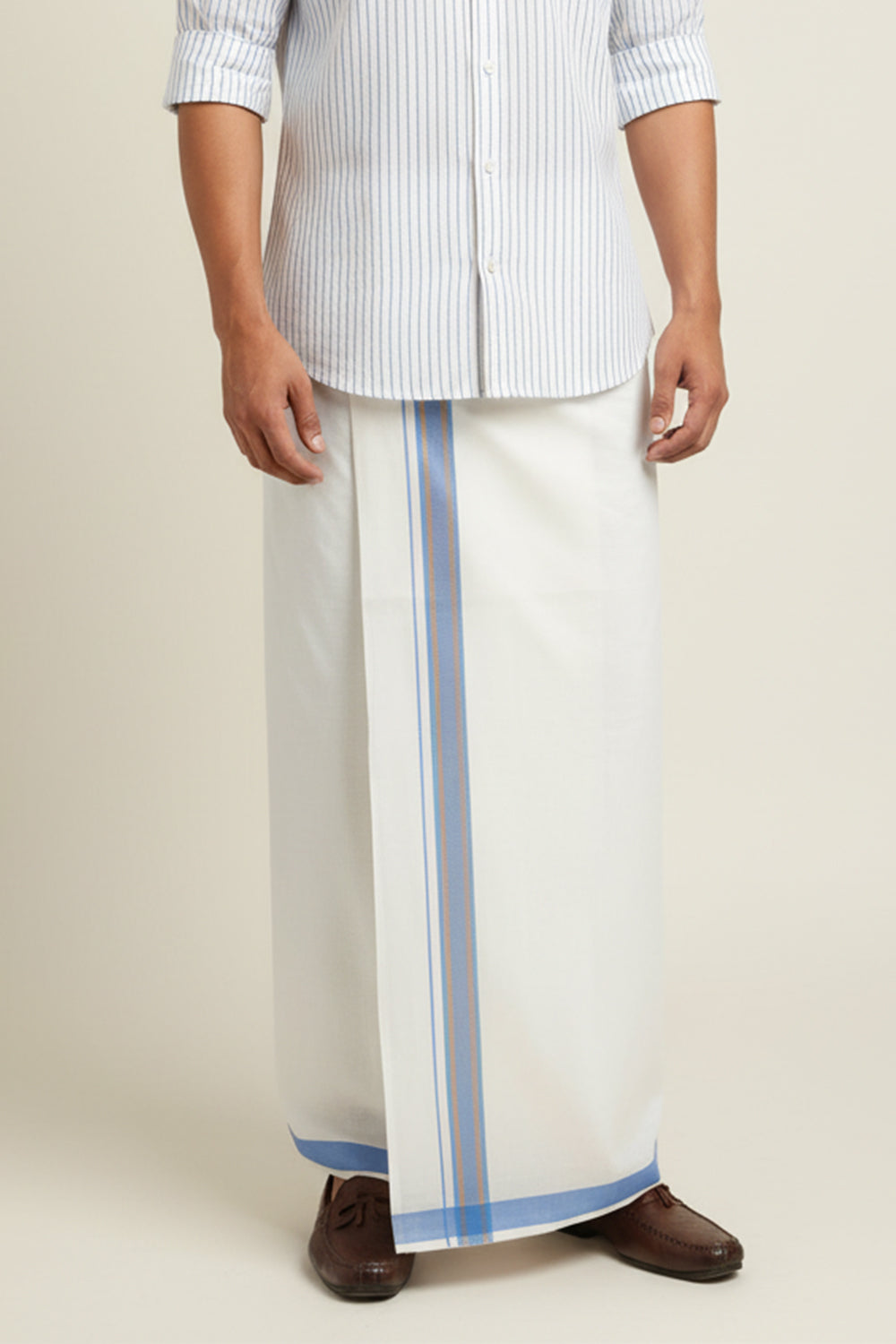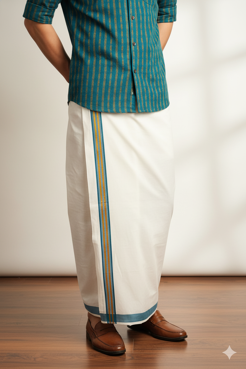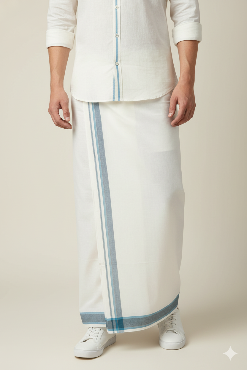 White Cotton Dhoti with Blue and Gold Border