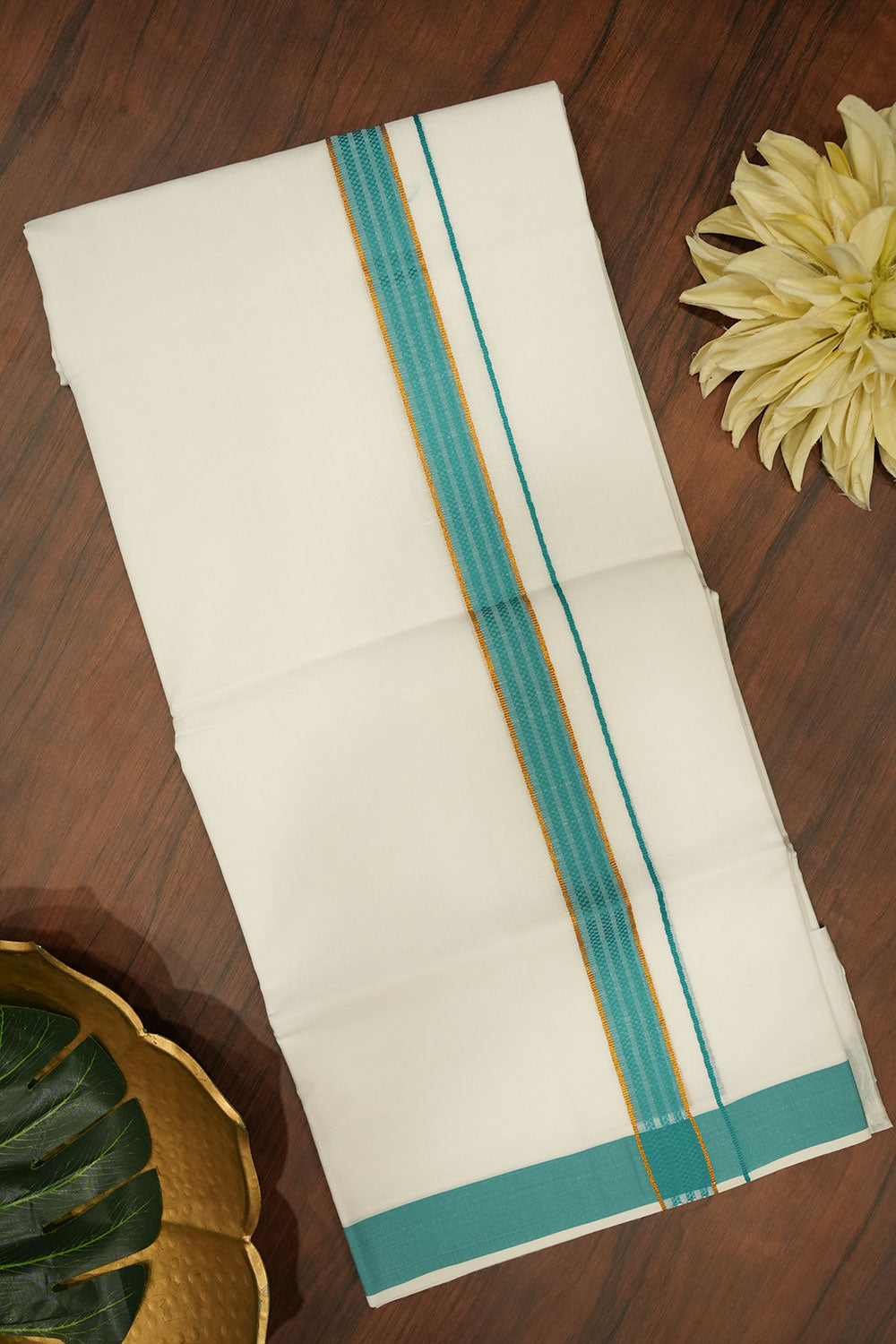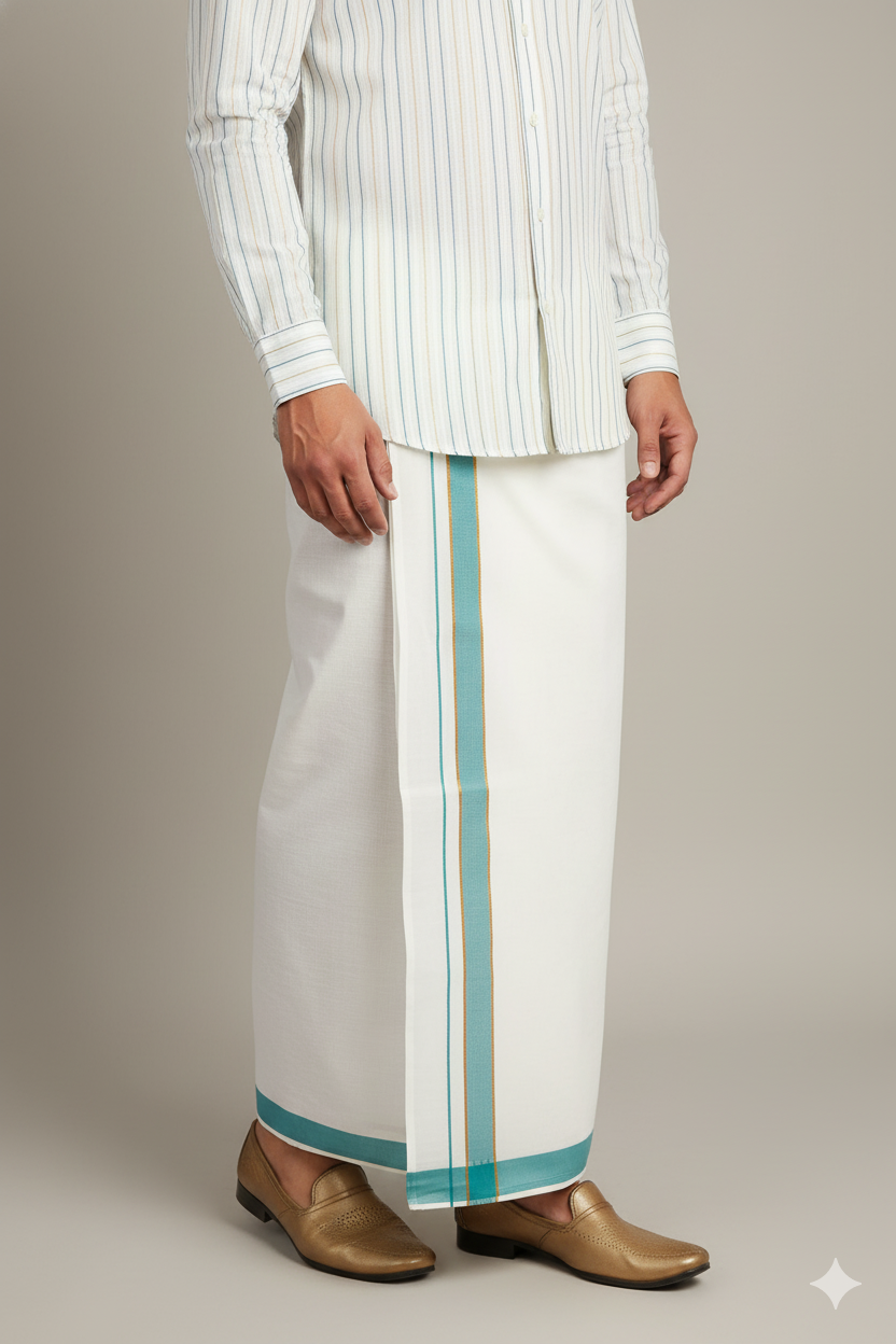 White Cotton Dhoti with Green and Gold Border