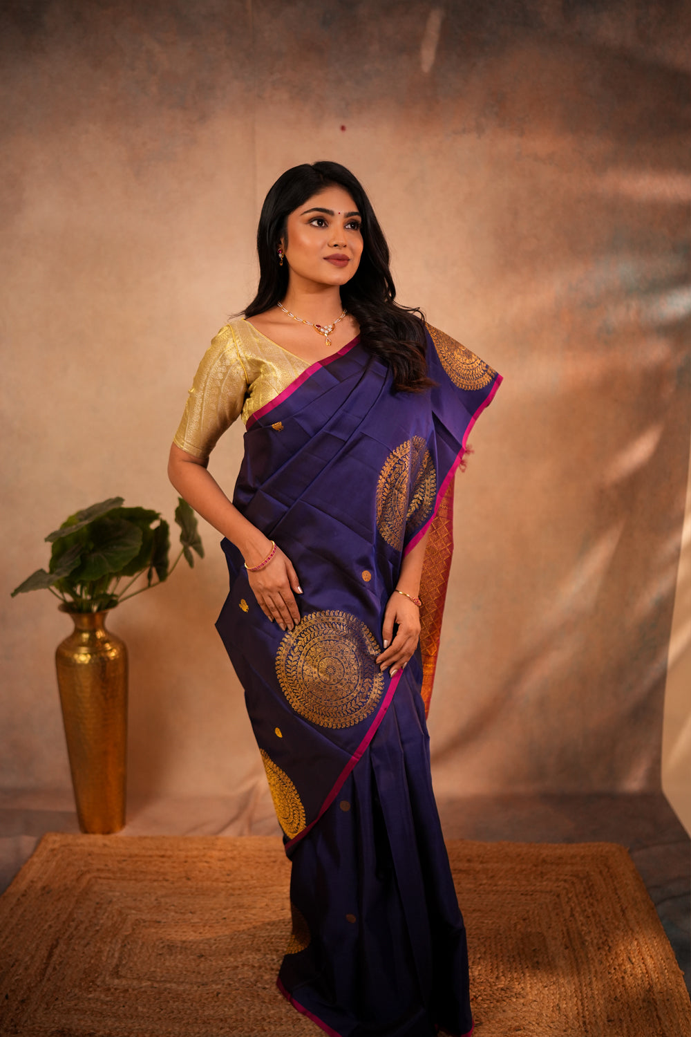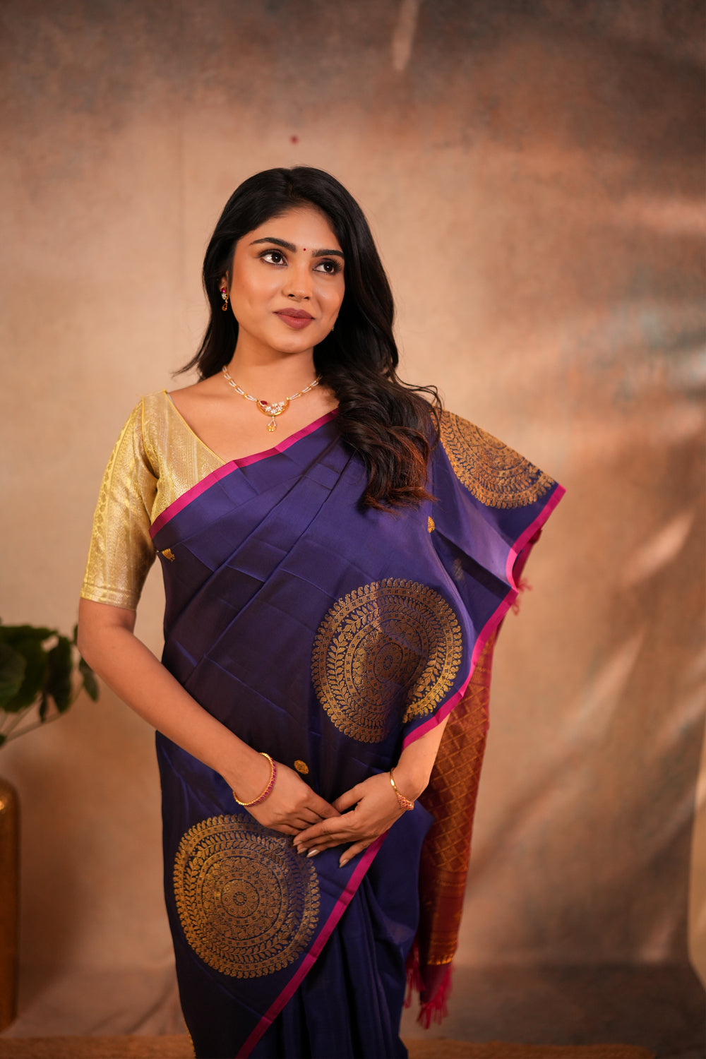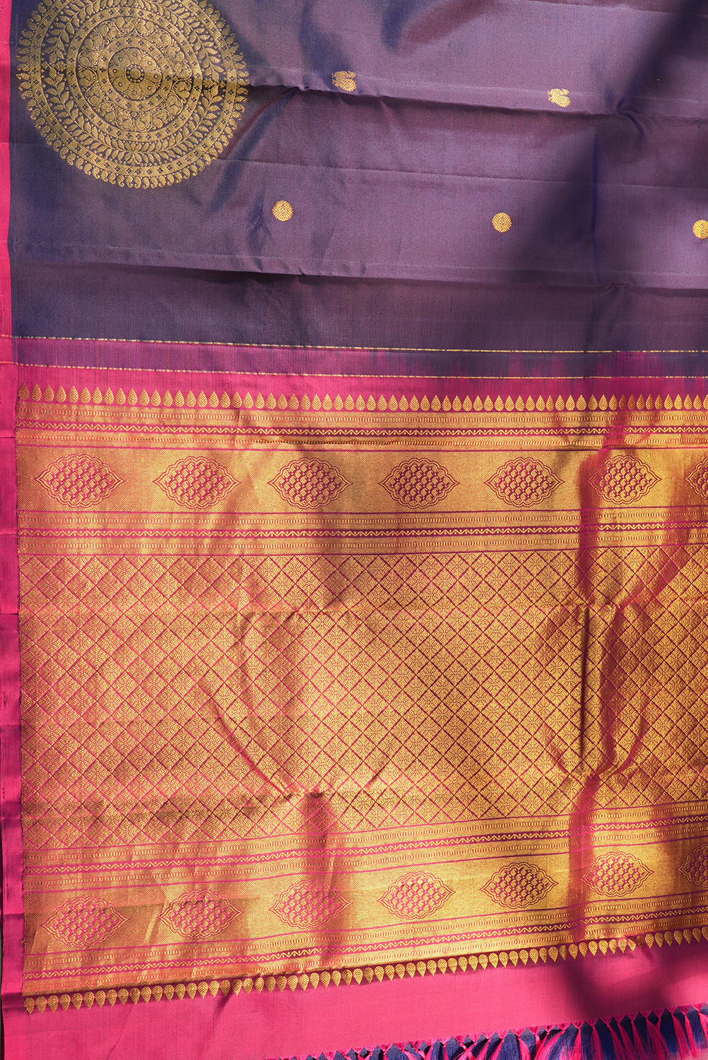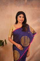 Regal Royal Blue Kanjivaram Silk Saree with Magenta Border & Gold Mandala Buttas