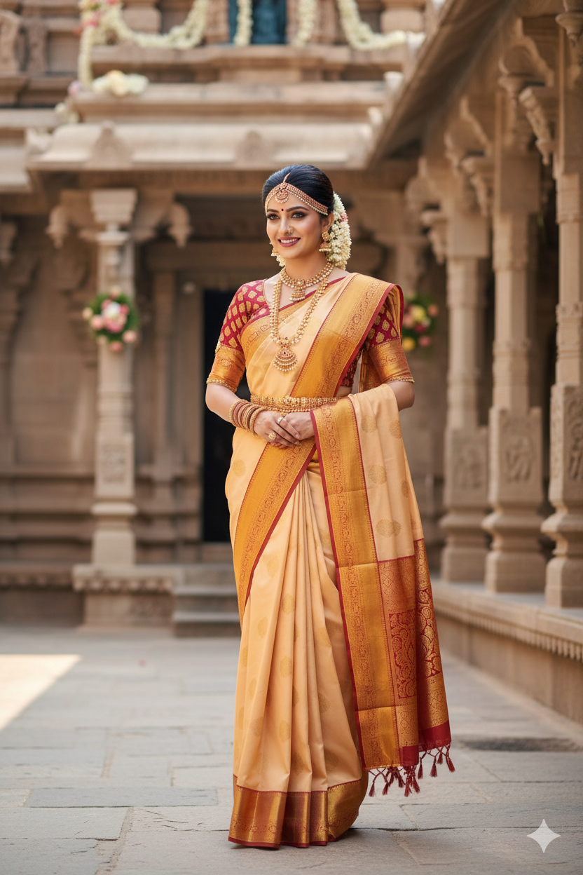 Kanchipuram silk sarees are beautiful tales woven in a six yard canvas of pure silk and lustrous zari. Considered an iconic part of India's rich heritage of handloom weaves, Kanchipuram pattu sarees are revered for their vibrant heartstopping  colours, charming motifs that enchant with artistic excellence , and lustrous zari that can put the stars to shame. KNOW MORE