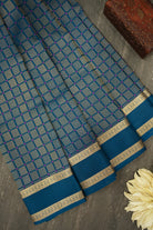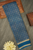 This stunning Mysore silk saree features a deep peacock blue body with a checkered pattern woven in shimmering golden zari and accented with small pink dots. The intricate geometric design adds a modern touch to the traditional drape. The saree is finished with a solid peacock blue border and a thin line of golden zari, adding a touch of classic elegance. This beautiful and luxurious saree is a perfect choice for festive occasions, weddings, or any special event.