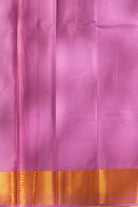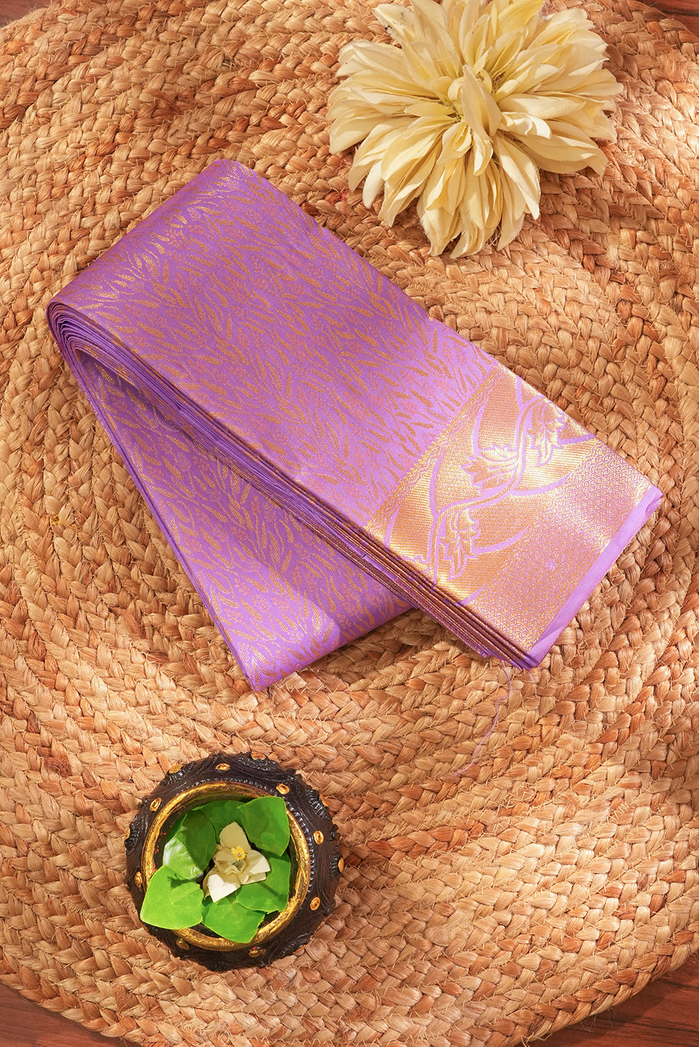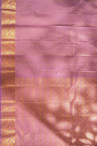 Radiate serenity in this exquisite silk saree in a soft lavender-lilac hue. The body is intricately woven with delicate golden zari leaf motifs that catch the light beautifully, leading into a broad, elegant border featuring traditional floral vine patterns. Lightweight and lustrous, it’s an ideal ensemble for morning weddings or festive gatherings. Unstitched blouse attached.