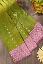 Radiant Lime Green Soft Silk Saree with Lavender Geometric Zari Border