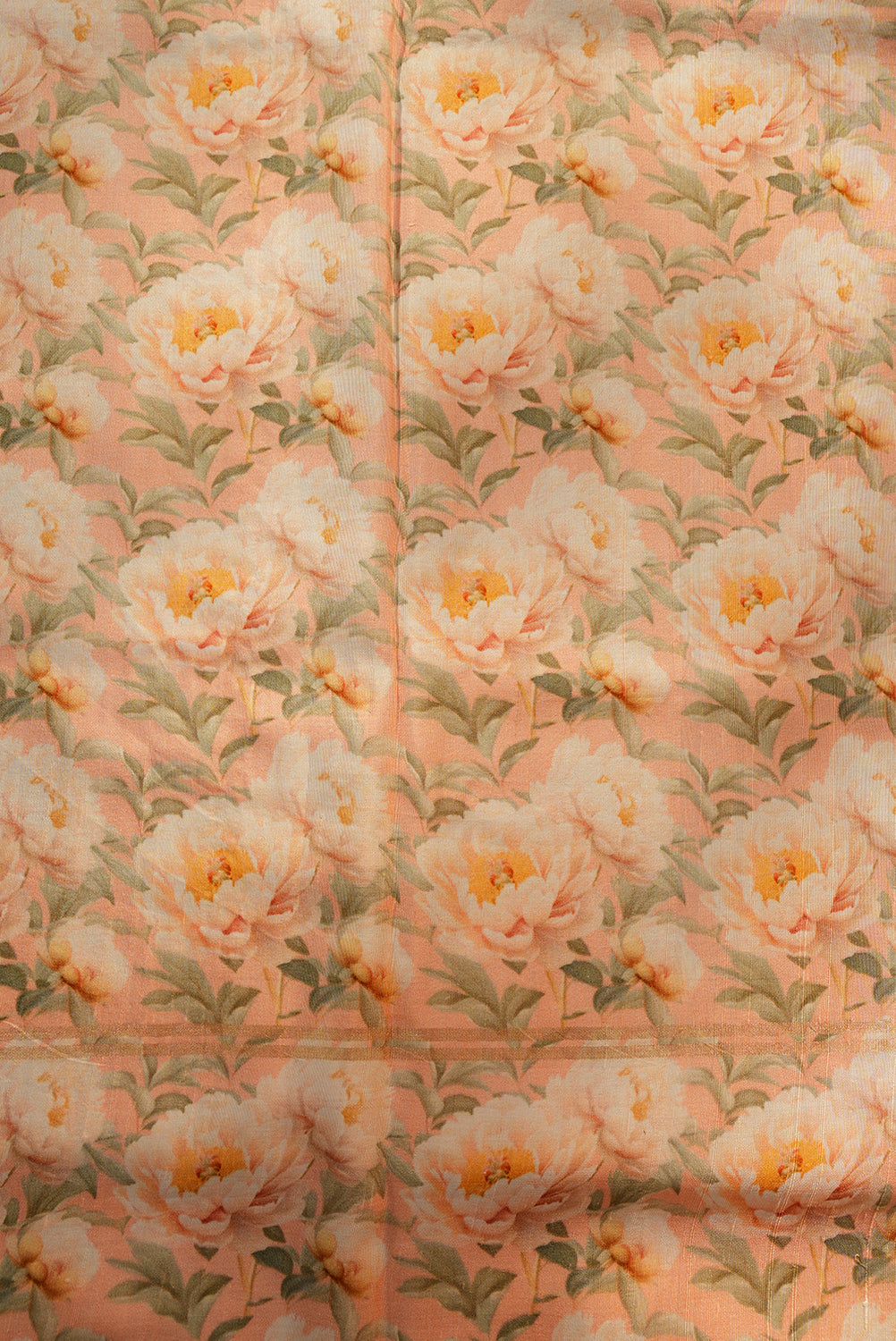 This lightweight silk saree features a calming aqua blue body with a subtle textured stripe pattern. The elegance is elevated by the wide border, showcasing large, soft apricot and peach-toned floral prints. A perfect blend of modern sophistication and classic silk texture, ideal for daytime events and summer celebrations.