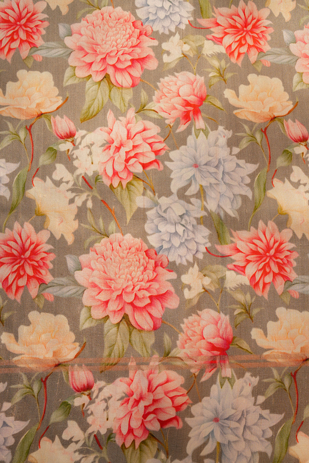 Make a striking statement with this gorgeous silk saree. The body is a classic deep black with subtle, shimmering woven stripes that add texture. This dramatic canvas is offset by a bold, watercolour-style floral print border featuring large blossoms in soft coral pink, dusty blue, and cream. It's the perfect fusion of traditional fabric and contemporary design.