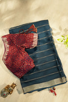 Drape yourself in sophistication with this pure satin designer saree in a deep, rich teal. The fabric is beautifully accented with subtle, shimmering horizontal stripes and a gold zari border. It is perfectly paired with a contrasting, heavy maroon brocade blouse featuring intricate gold embroidery on the sleeves and neckline