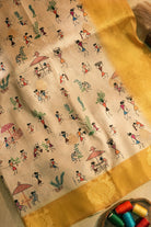 Cream & Mustard Tussar Silk Saree with Hand-Painted Warli Art
