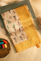 Celebrate heritage with this exquisite Cream Tussar silk saree. It features a striking Mustard Yellow border with ornate gold zari weaving, beautifully contrasted by intricate Warli tribal motifs depicting rural life across the body. Unstitched blouse attached.