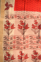 Embrace the timeless charm of hand-block prints with this vibrant red cotton saree. Featuring a delicate black leaf motif across the body and a striking cream border adorned with bold floral accents, it’s a perfect blend of tradition and comfort. Unstitched blouse attached.
