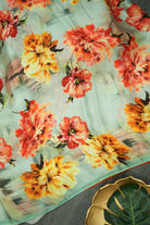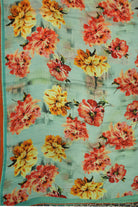 This stunning dola silk saree features a beautiful watercolor floral print on a light mint green base. The large, vibrant blossoms in shades of coral, red, and mustard yellow create a striking and artistic look. The smooth fabric drapes elegantly, while the subtle texture in the background adds depth. This saree is perfect for special occasions where you want to make a chic and sophisticated statement.