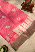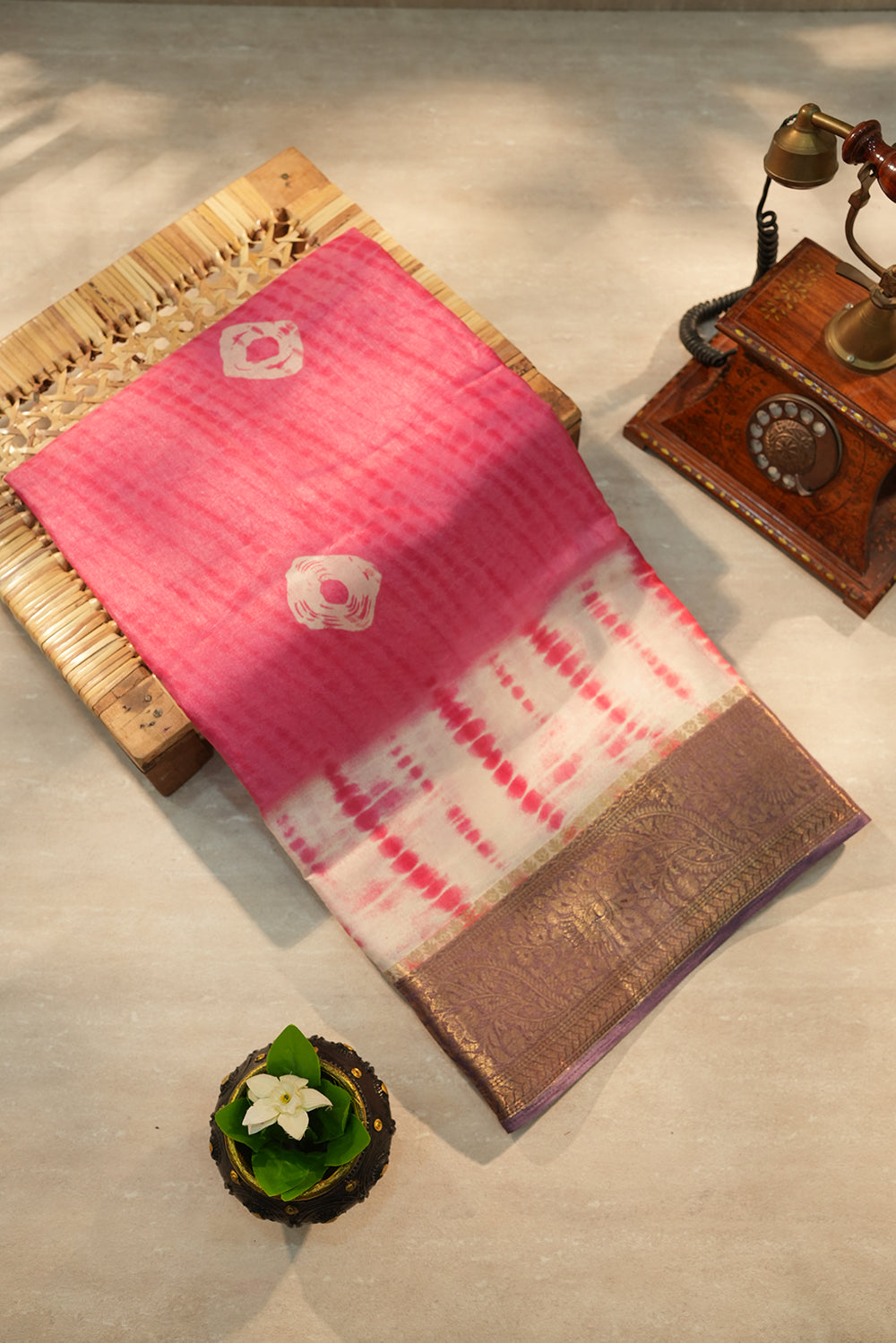 A masterpiece of texture and color, this raw silk saree features a vibrant fuchia pink body that seamlessly transitions into a pristine pearl white. Adorned with delicate hand-dyed patterns and a rich, traditional copper-toned Zari border. unstitched blouse attached.