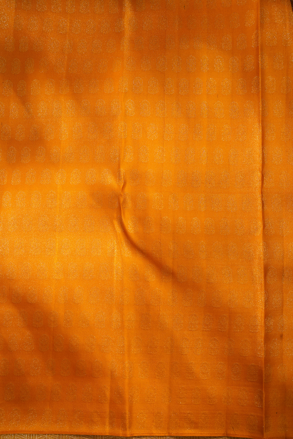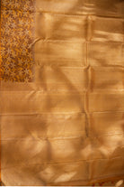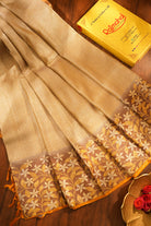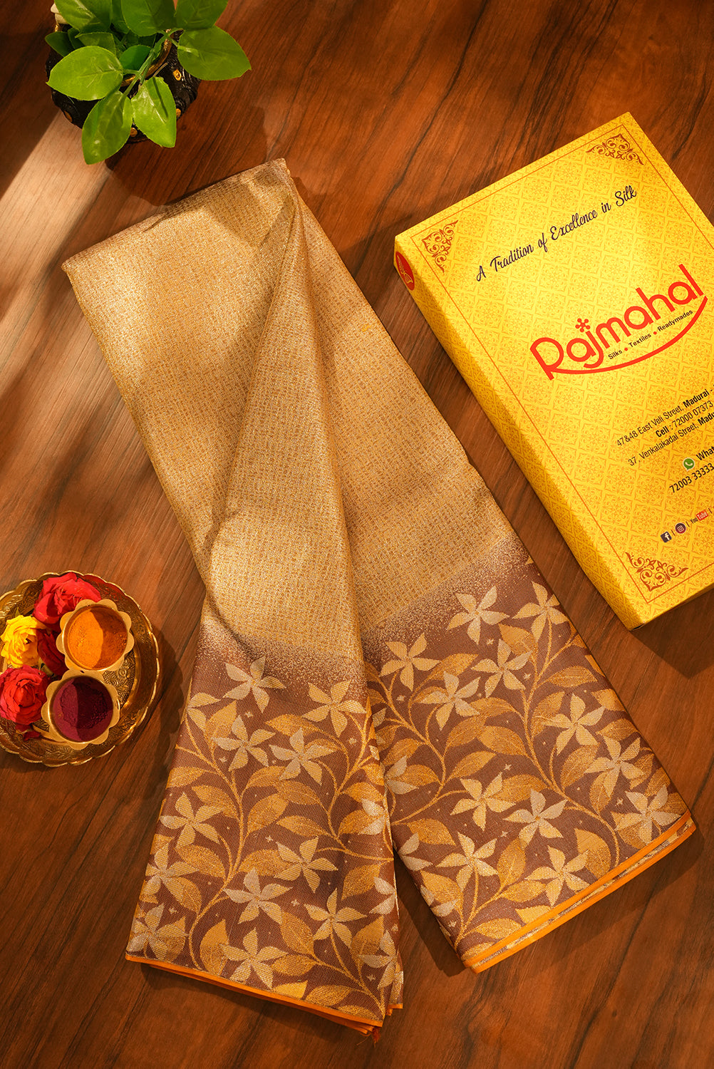 Exude timeless grace in this Golden Beige silk saree, featuring a subtle metallic sheen that catches the light beautifully. The body transitions into a rich Cocoa Brown border adorned with intricate cream and gold floral vine motifs. Finished with delicate mustard-yellow tassels, this piece is a perfect choice for weddings or high-end evening events. Unstitched blouse attached.