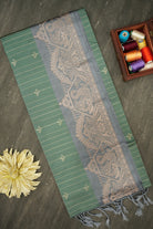 This elegant soft silk saree features a beautiful light green body, subtly woven with small motifs and thin stripes. The highlight of the saree is its wide pallu and border in a contrasting light gray, which is richly woven with an intricate traditional pattern in a lighter tone. This luxurious and lightweight saree is a perfect choice for weddings, festive occasions, and special events.