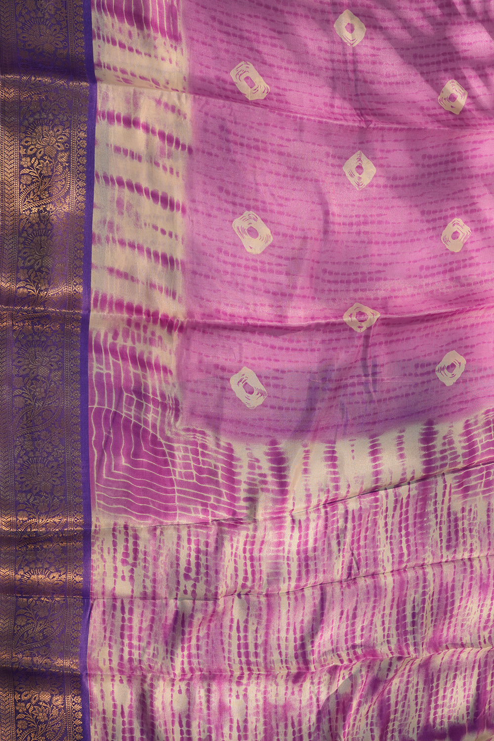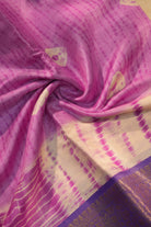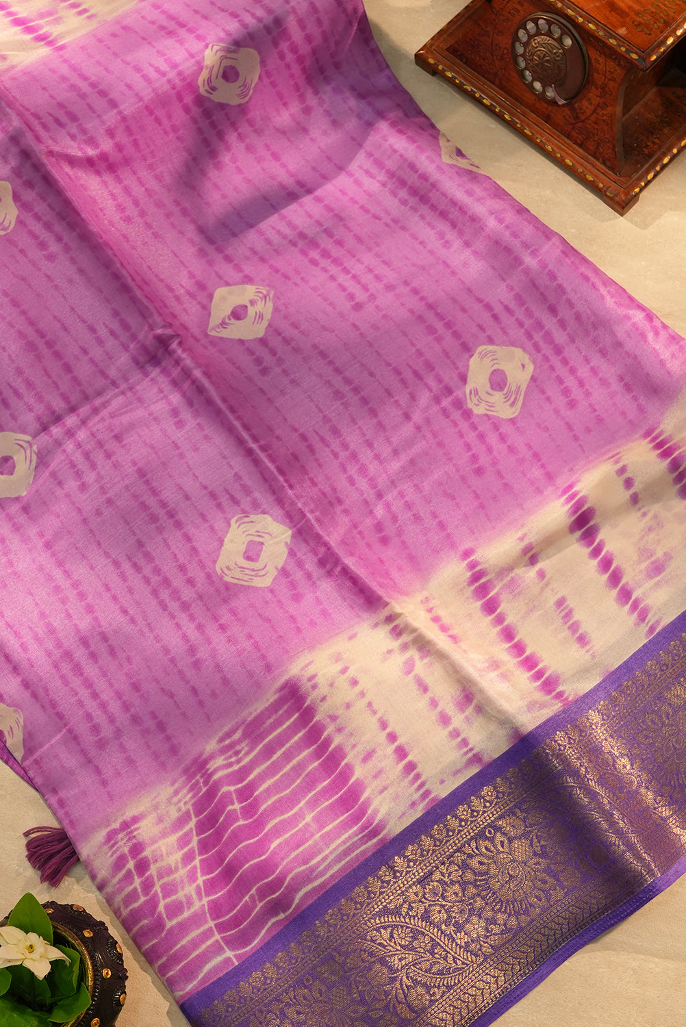 Elevate your ethnic wardrobe with this exquisite raw silk saree featuring a unique lavender and cream shibori-style tie-dye pattern. The body is highlighted by a central circular motif, leading into a striking deep purple border adorned with intricate golden floral zari work. Unstitched blouse attached.