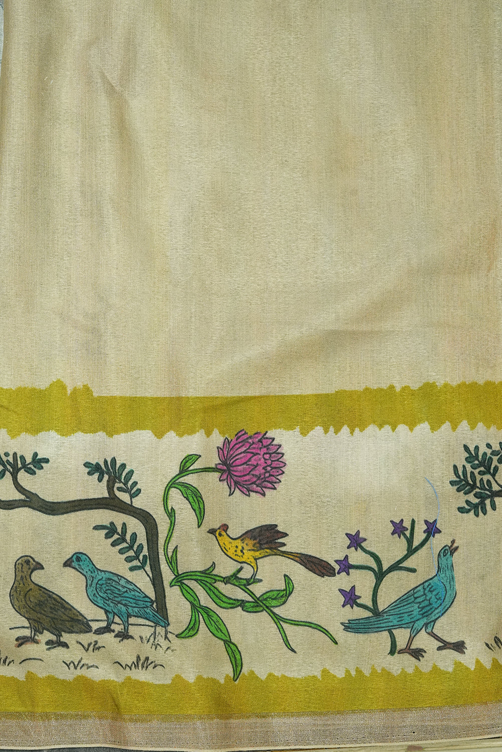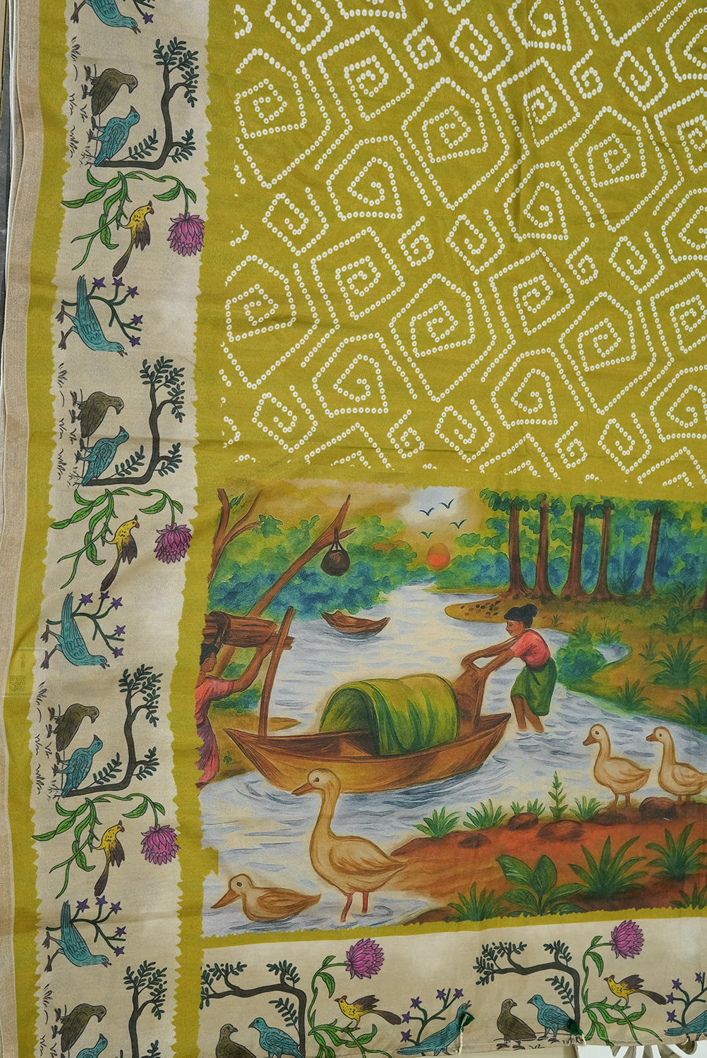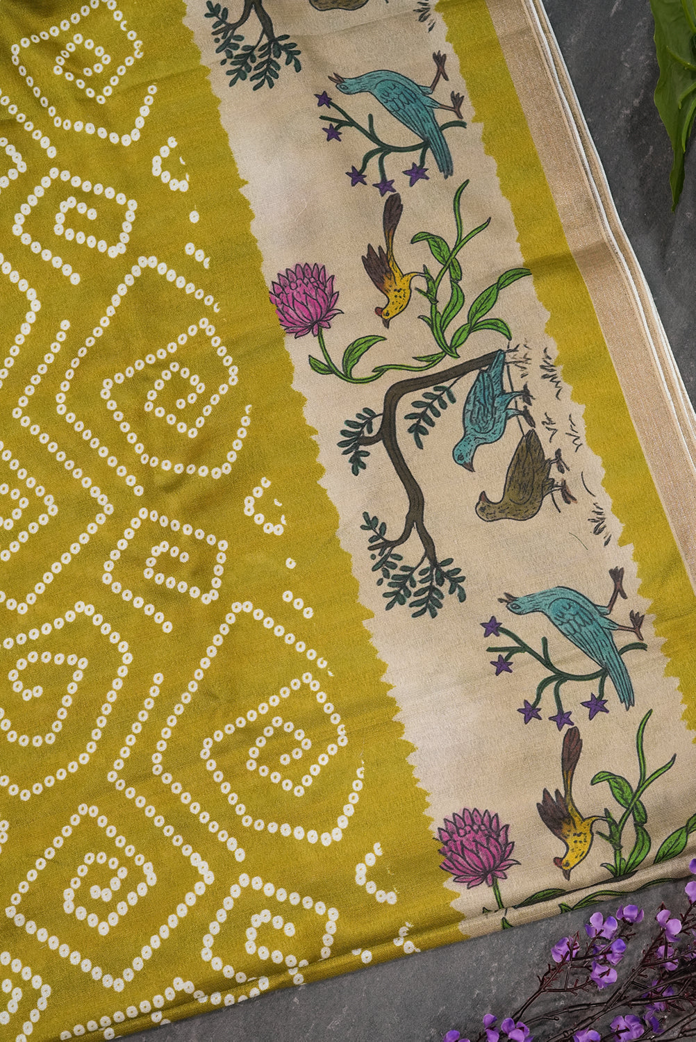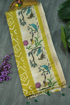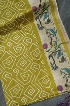 Radiate timeless grace in this exquisite Mehandhi Green Tussar silk saree. Featuring traditional white Bandhani-style geometric patterns across the body, it is beautifully framed by a cream border adorned with intricate Kalamkari-inspired bird and floral motifs. Unstitched blouse attached.