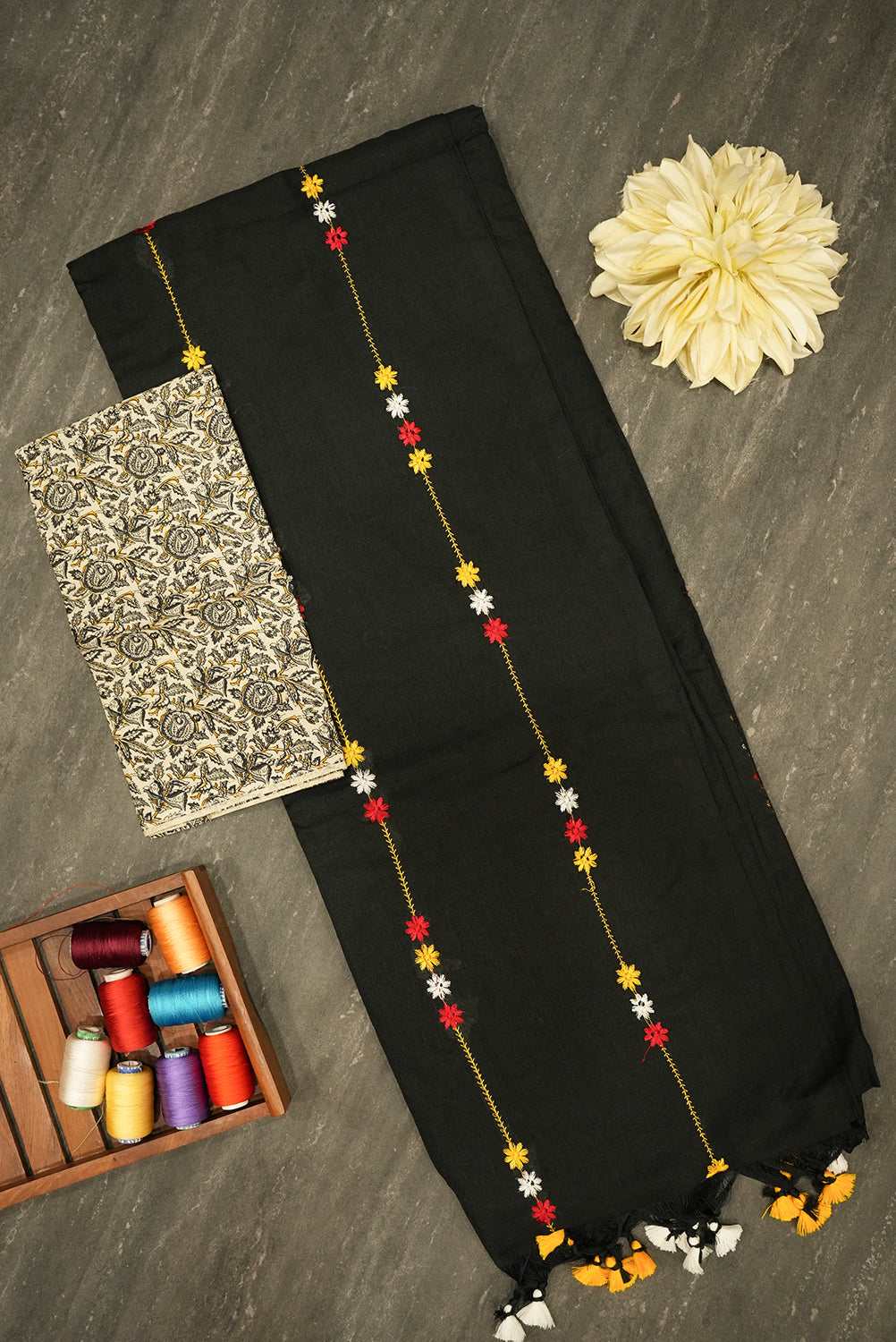 Elevate your everyday elegance with this sophisticated black pure linen saree. It features delicate, vertical hand-embroidered floral chains in vibrant shades of sunflower yellow, cherry red, and crisp white. The look is perfectly balanced with a contrasting Kalamkari-style printed blouse in cream and black.